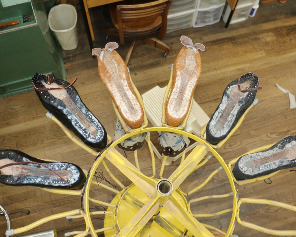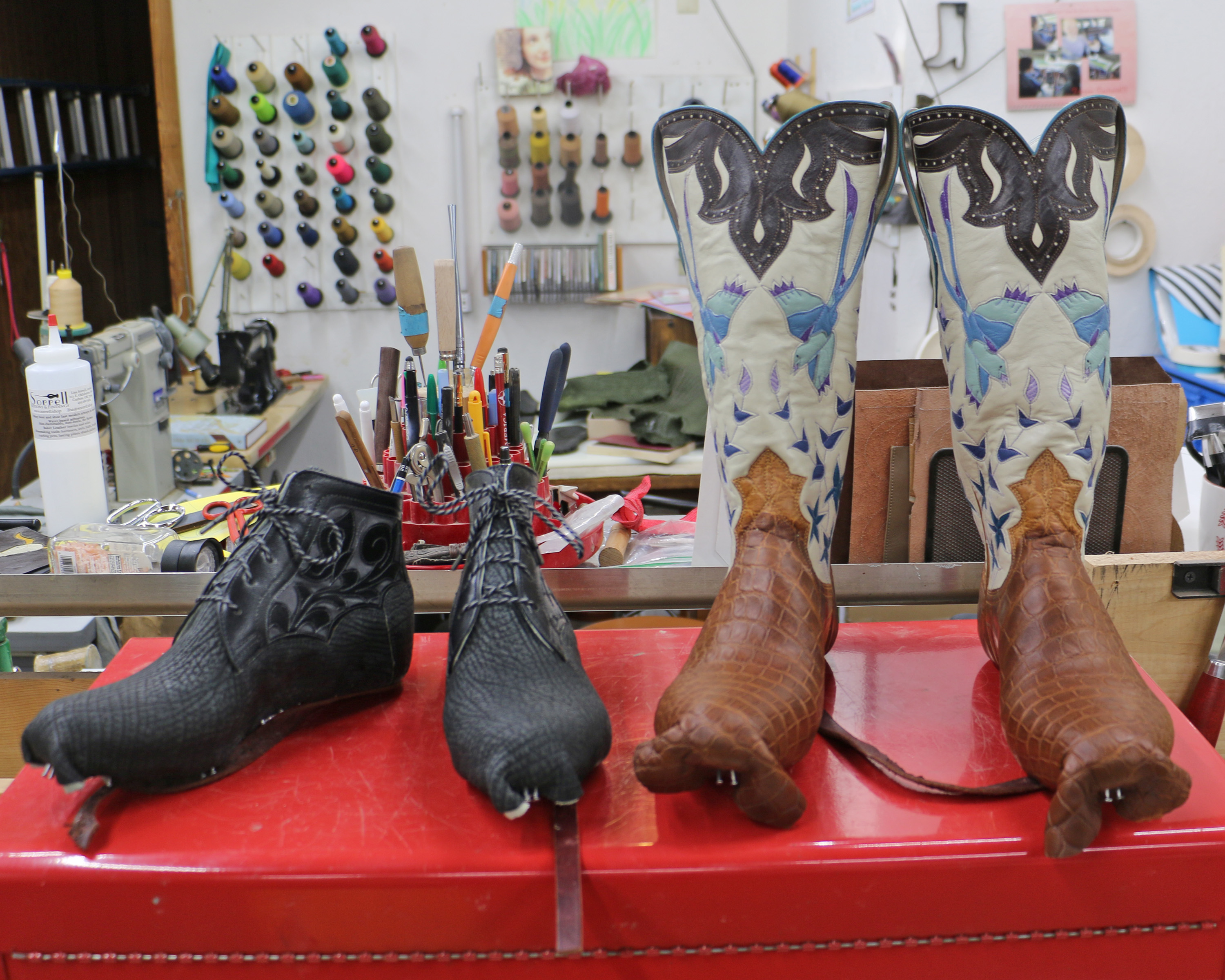 The side seams on cowboy boots are sewn with the right sides of the boots together so they’re inside-out. They’re turned (or wrestled) the right way out and then they’re ready to be put on the last, or boot form.