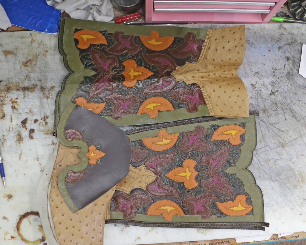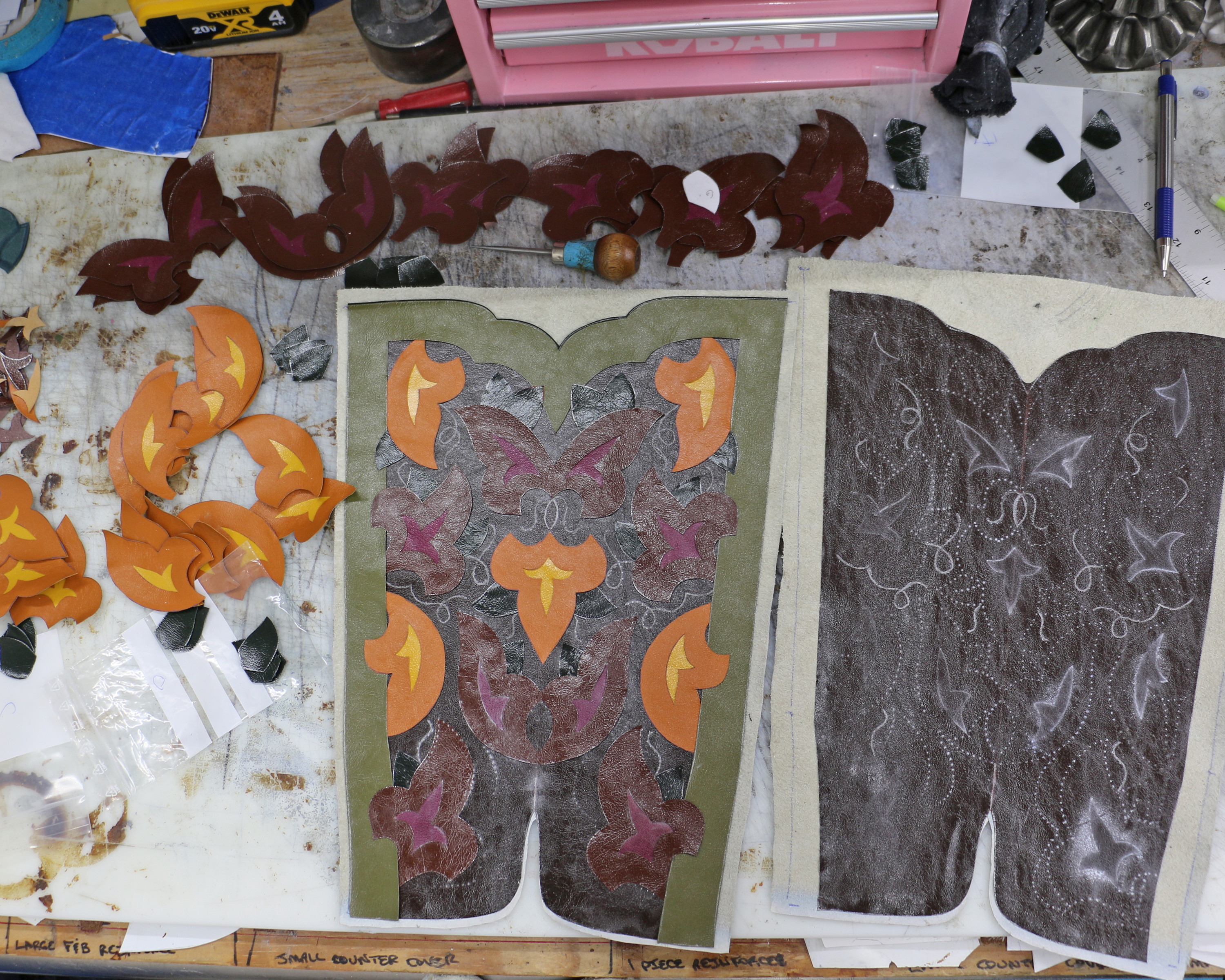No one taught me to pattern so I developed this slightly obsessive method on my own. When I first started I would have used the large pattern on the left, laid it on the leather, rubbed a powder bag over it to transfer the design, cut out that flower, and repeat… over and over. What I hated most about it was how much leather is squandered because it’s impossible to accurately position each piece. To avoid accidentally getting close to the edge you leave too much space and waste leather. Cutting each individual pattern piece before I begin takes a bit more time, but using those poster board pattern pieces to trace around results in absolutely accurate patterning with very little waste.