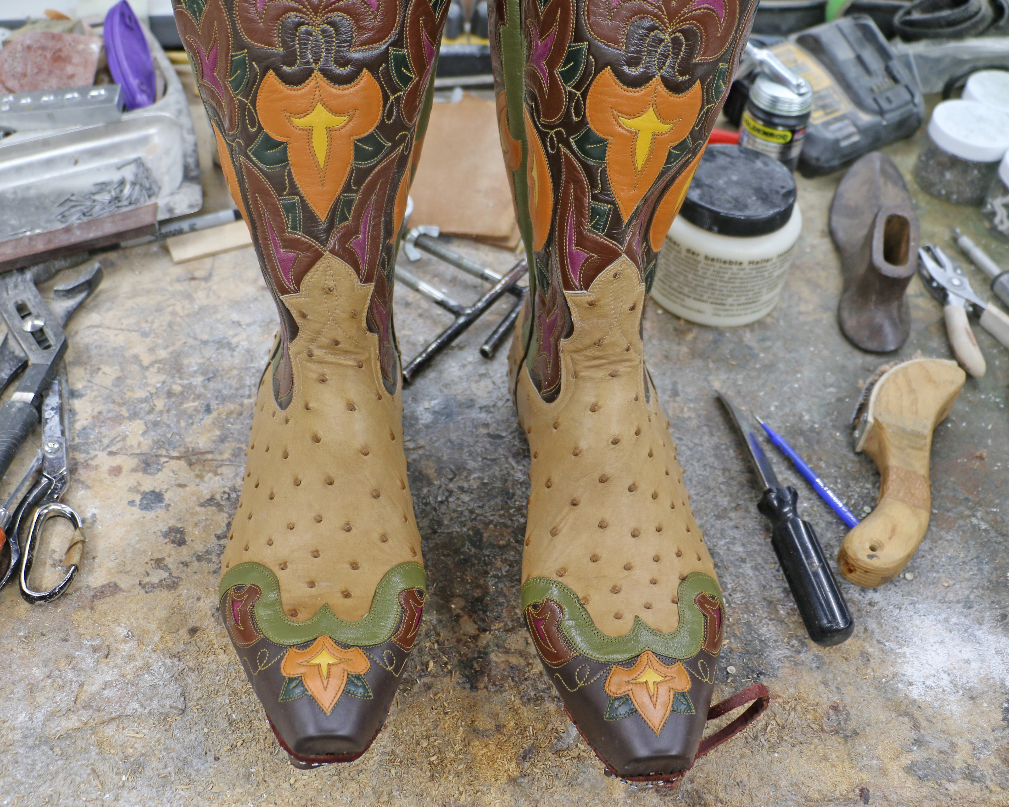 Ostrich is very likely to twist when being lasted; when there’s a wingtip on the toe it can be difficult to position if the boot is trying to twist. I decided to try lasting the boots first, letting them dry, taking them off the last, and sewing the wingtip exactly where the center wants to be. Here are things I’ve learned: