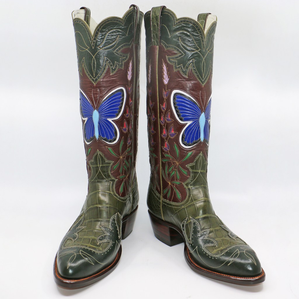 Butterflies are a common and traditional theme for cowboy boot top designs, probably because their outstretched wings fill the space so neatly. Usually they are stylized, drawn for shape and color more than accuracy. This butterfly, however, is the endangered Karner Blue butterfly of the American northeast. It feeds exclusively on the Wild Blue Lupine which is inlaid on either side of the butterfly.