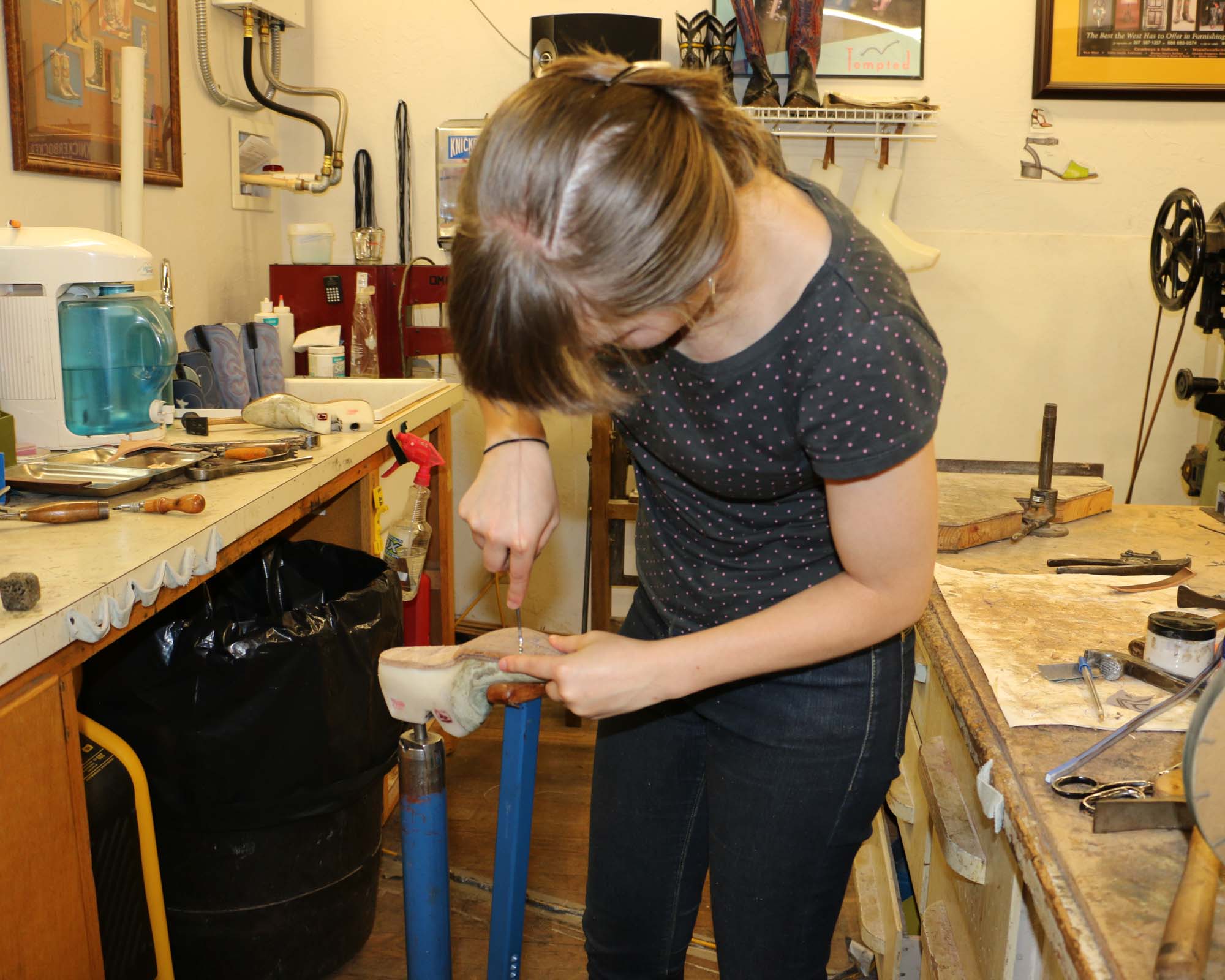 We’ve turned the boots and will be lasting them this morning. We’ve trimmed the insoles and Emelie is preparing the channel and prepunching the holes for inseaming.
