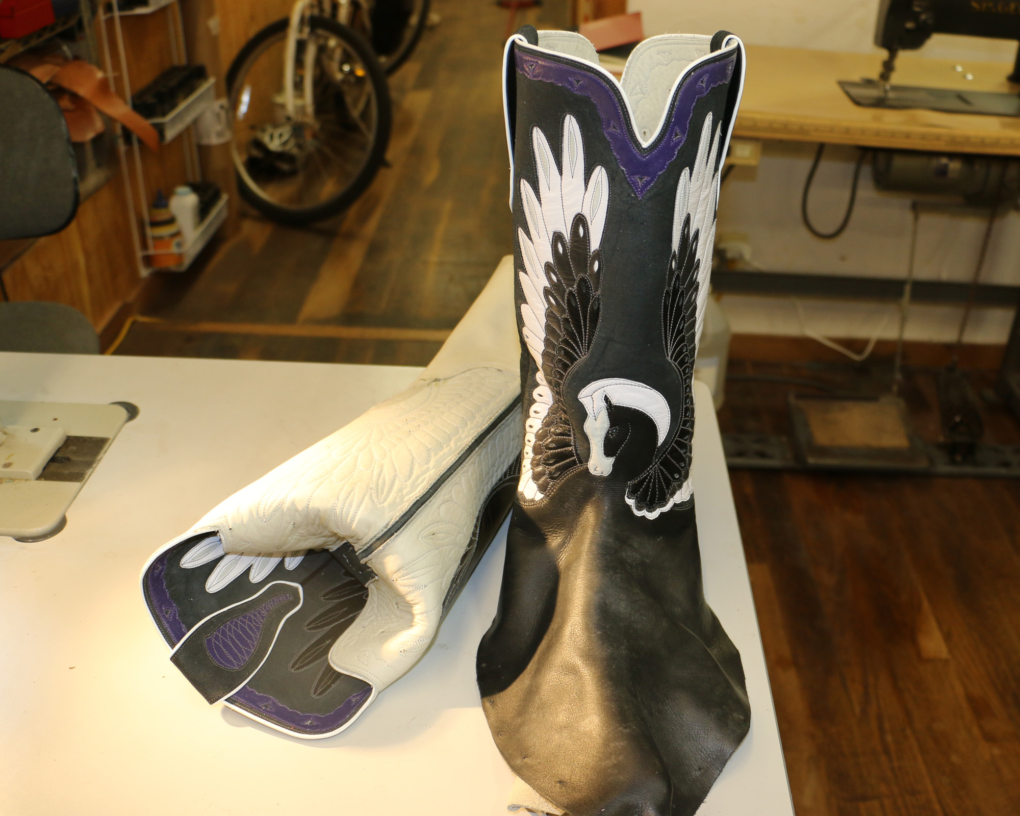 One boot has been turned and one is still waiting to have the pulls stitched down.