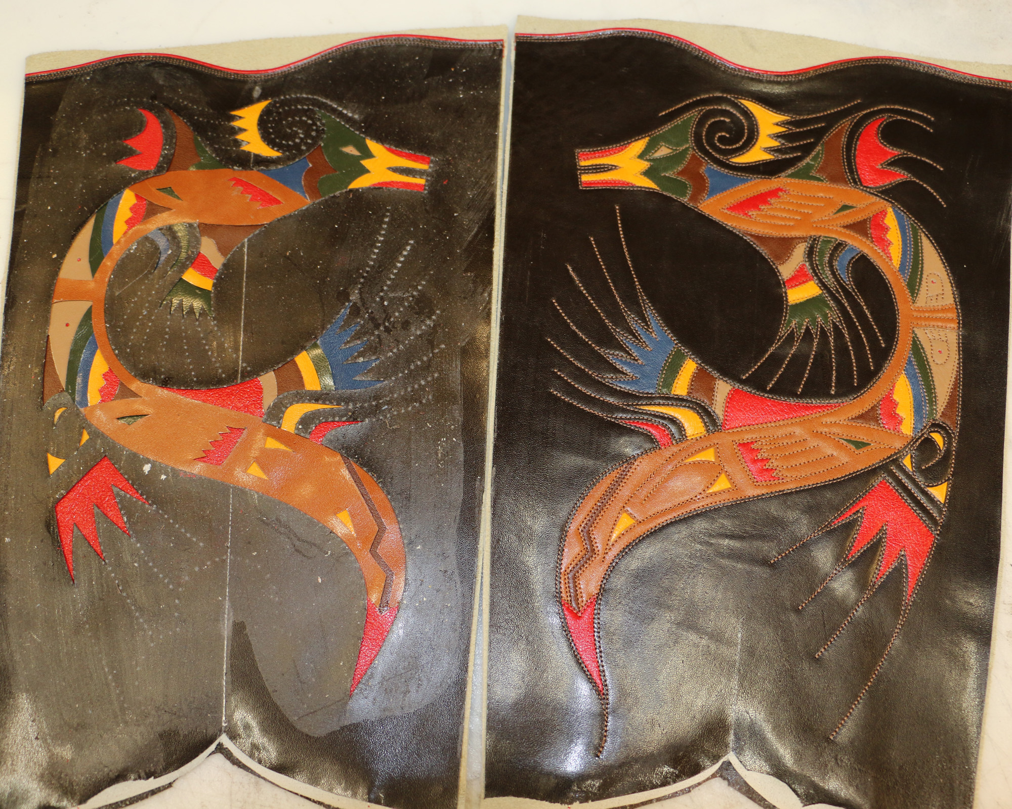 The one on the right has been stitched and cleaned. The one on the left will get to be beautified this afternoon. Each color is a different piece of leather–there’s no painting.