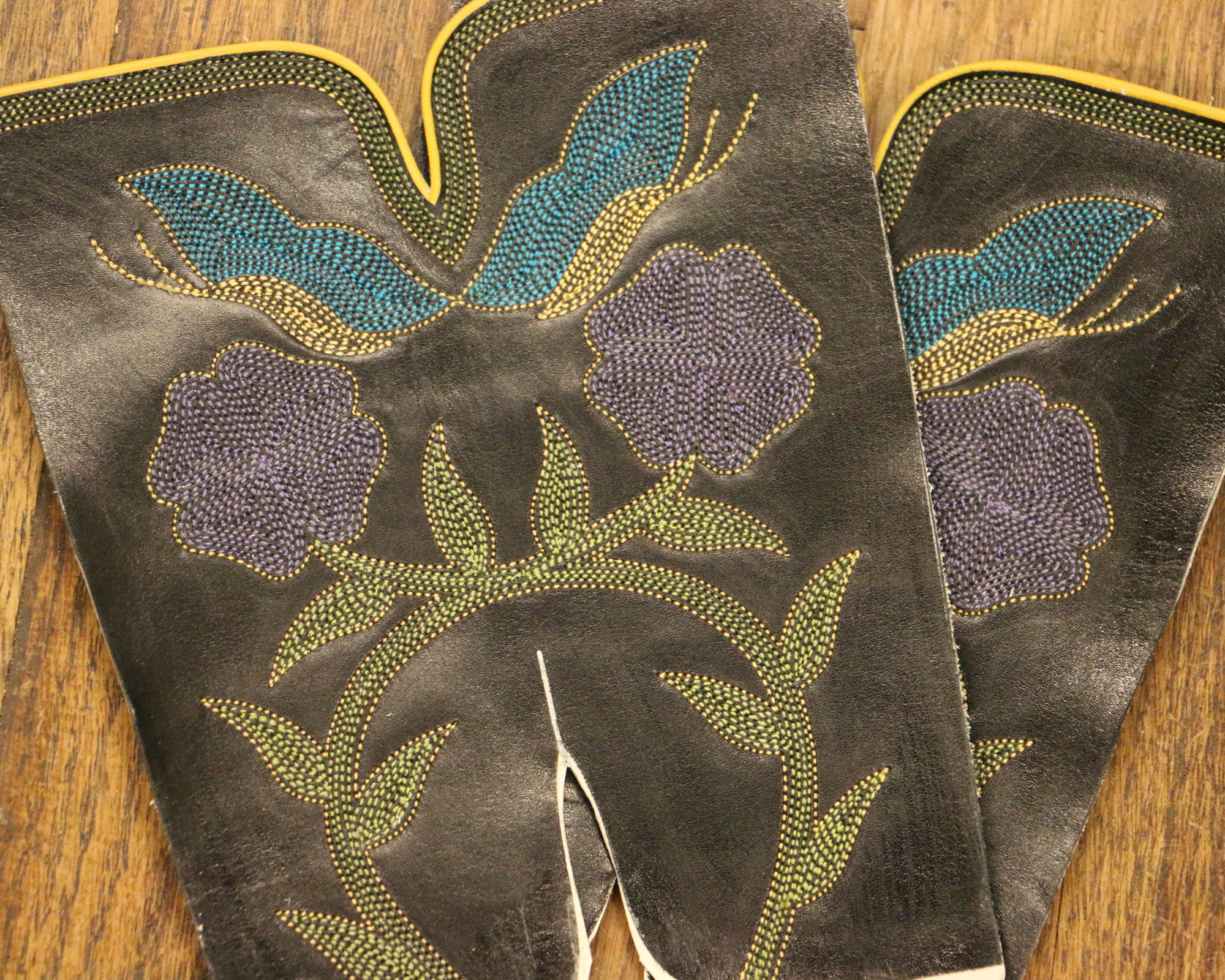 This is a new cowboy boot top design. It’s stitched with my new silk thread, one row at a time, on a single needle sewing machine. I’m rather proud of it!