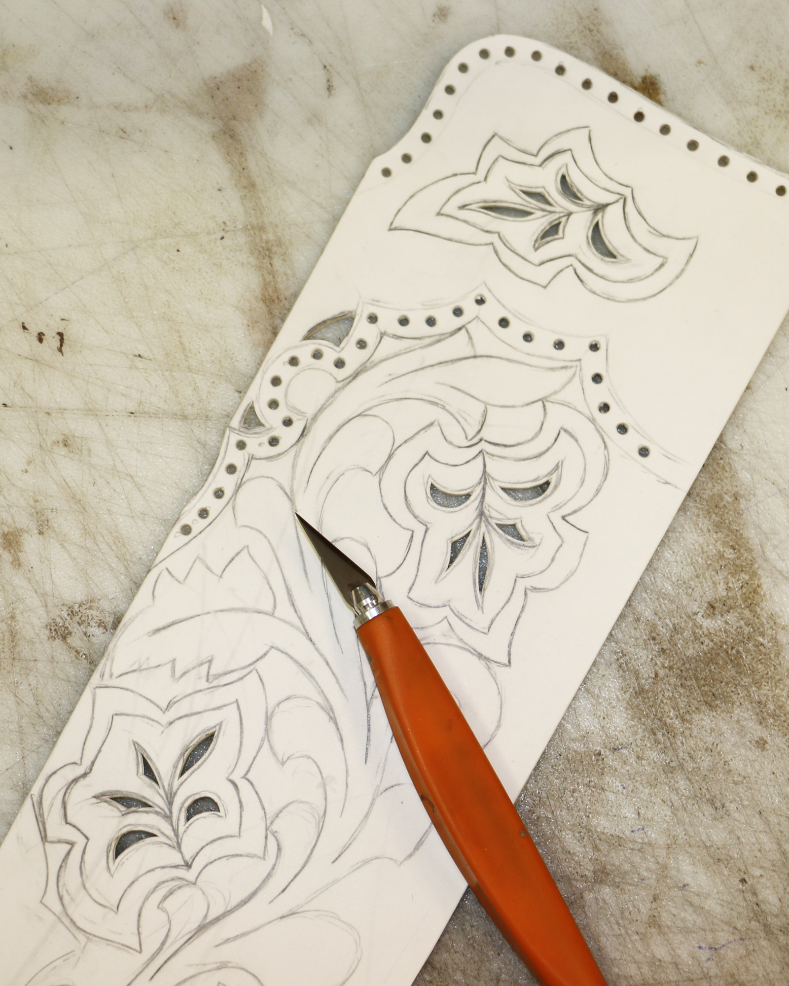 I’m starting a new boot top design. When there are tiny design elements I like to cut them out with a knife and draw the stitching line around the shapes so I’ll know exactly how they will fit.