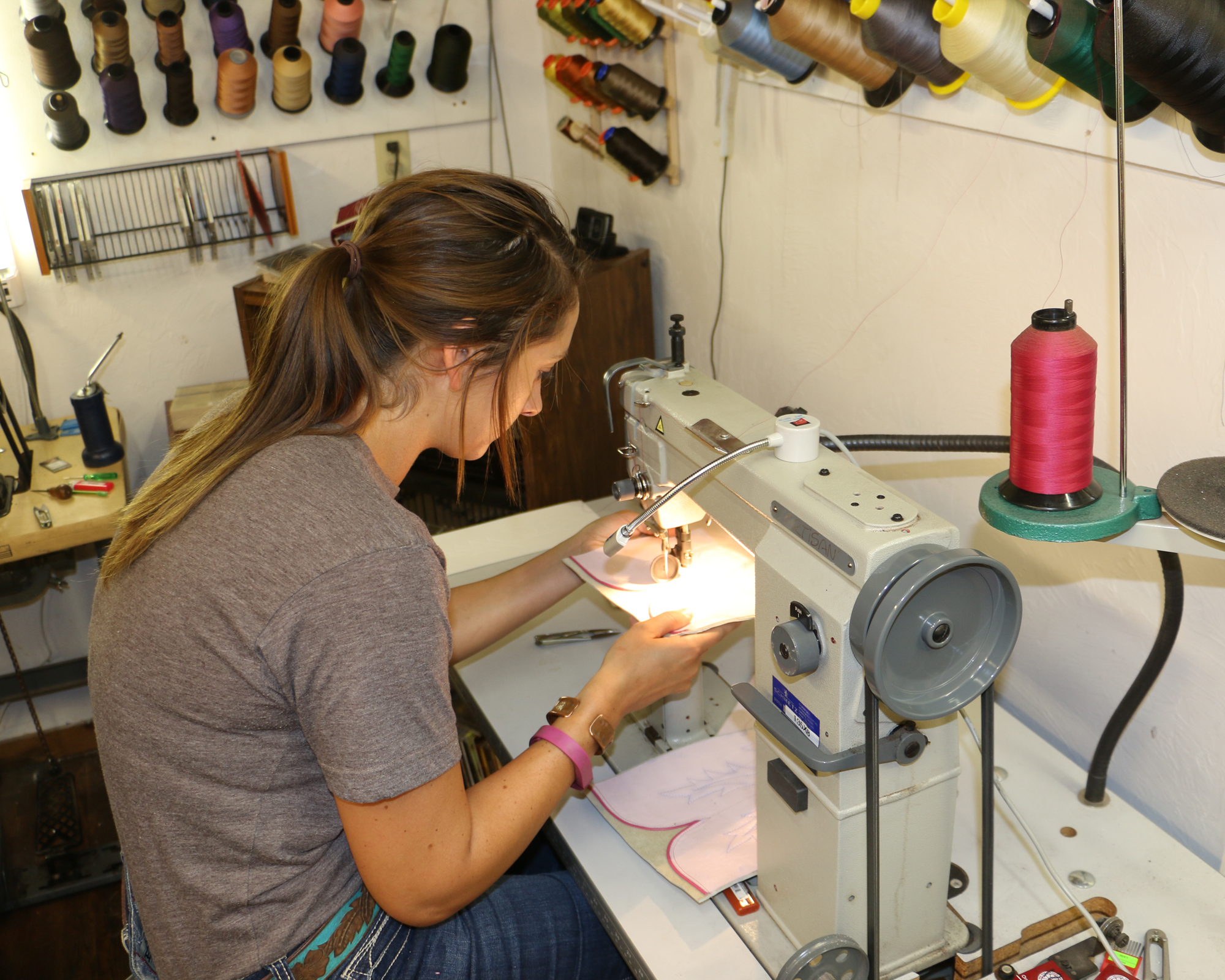Amber stitching her boot tops.