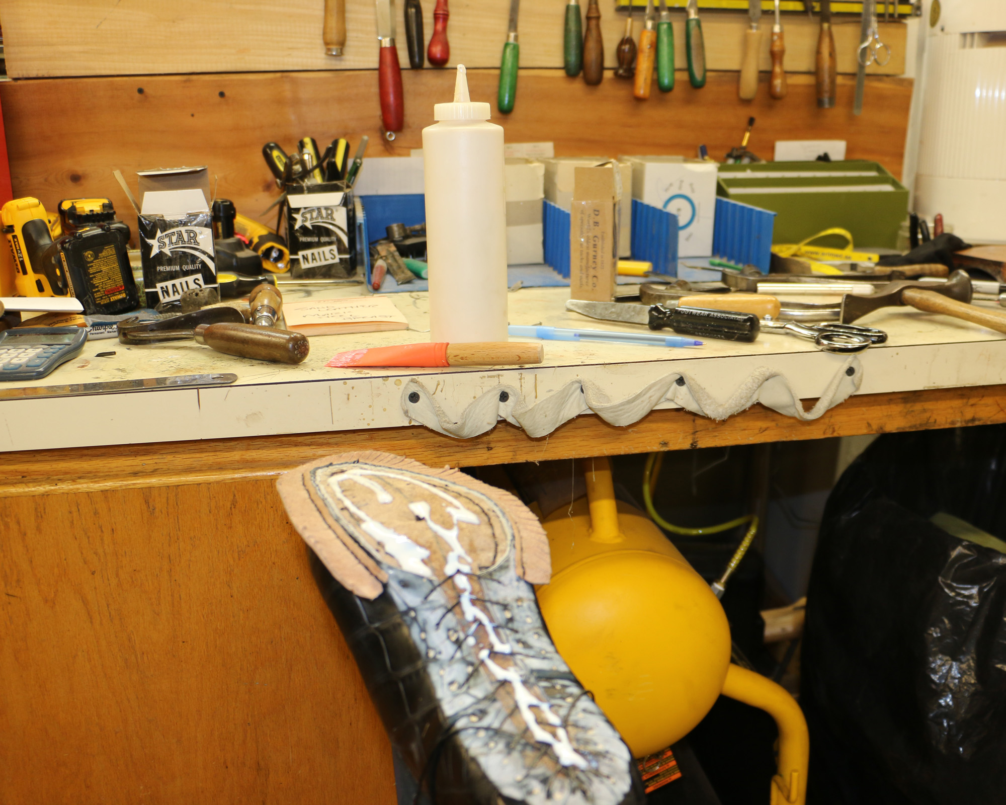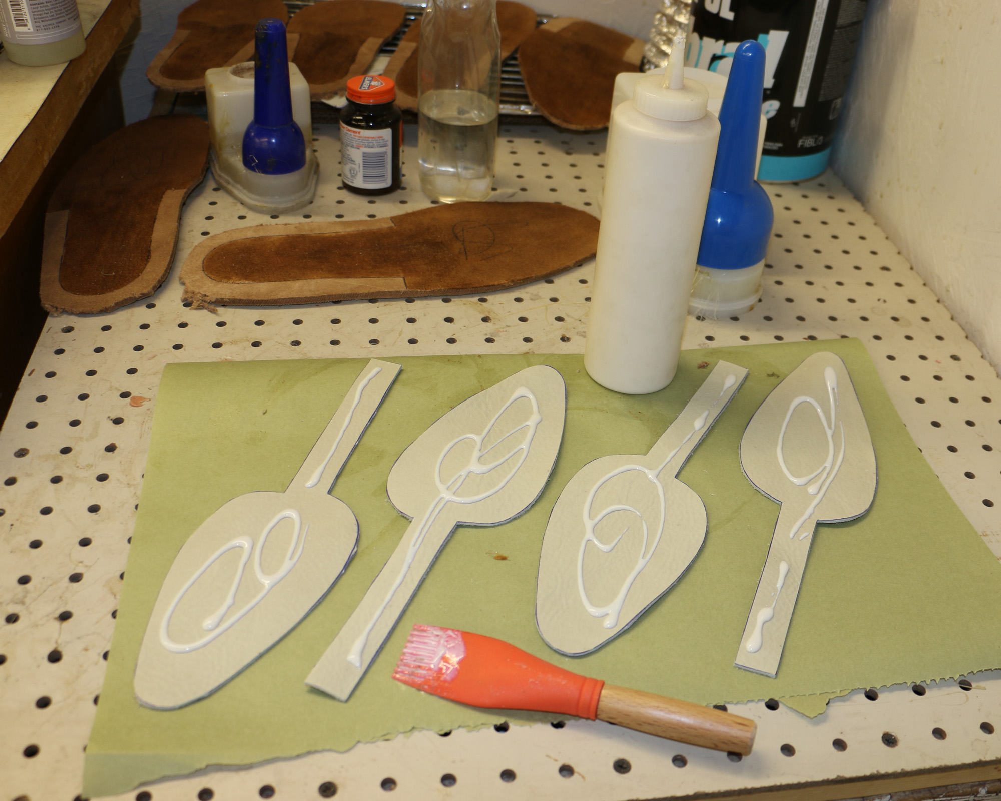 I’m glueing in a piece called the ball filler to bring everything up to level. Then I can lace in the steel shank. The best way I’ve found to apply the water-based contact cement is to use a squirt bottle and then spread the glue with the blade brush.