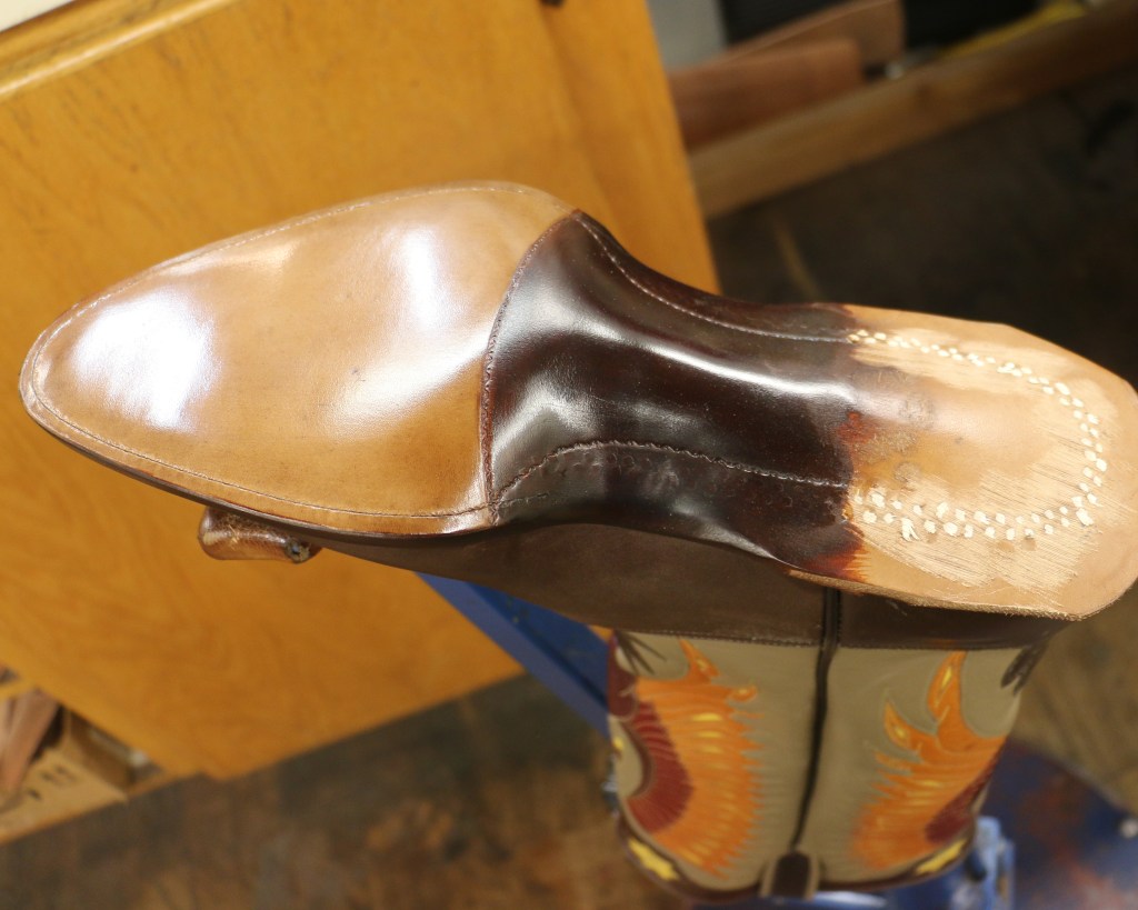 The soles are finished and now I’m ready to begin building the heels. If I’m careful I won’t mar the shiny finish when I’m leveling the heels.