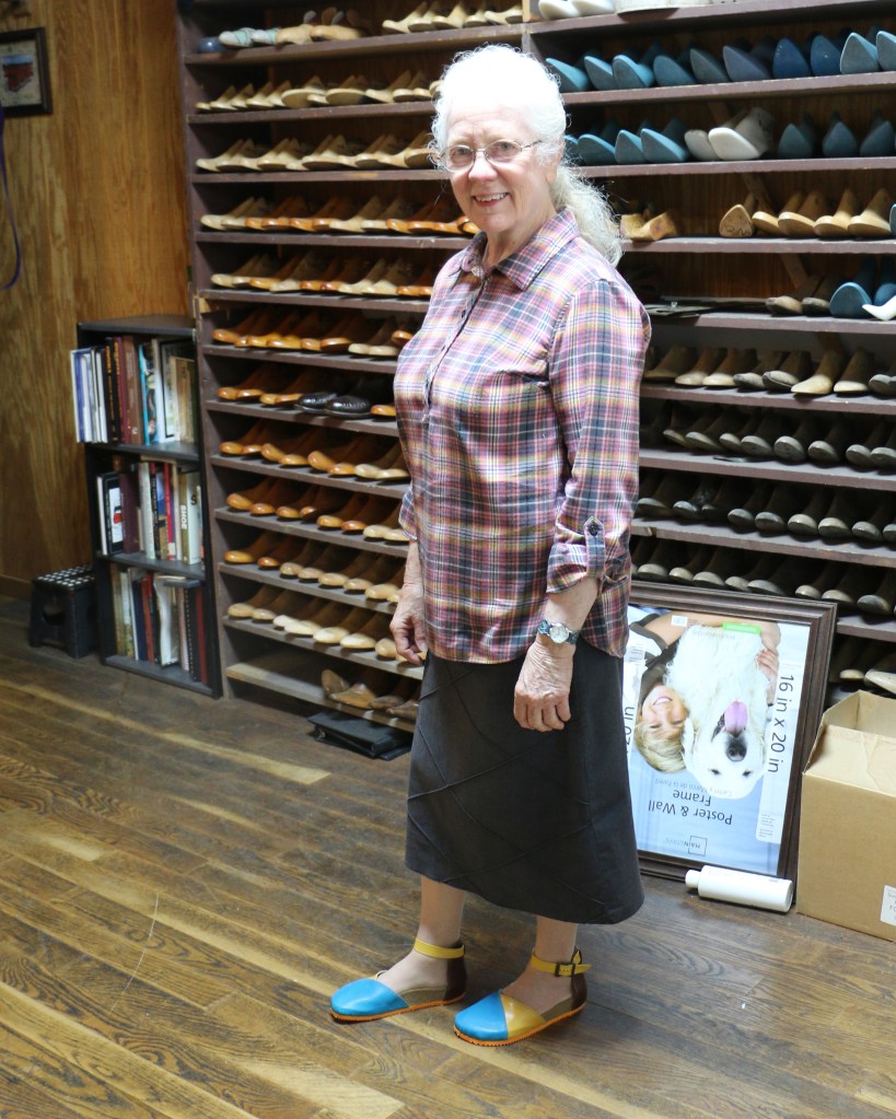 Mother in her new sandals that she helped to make.I told her that if anyone asked if they could also come to my shop and make their own sandals, I have two conditions and one or the other must apply. One: You must be my mother. Two: You must pay me a million dollars.