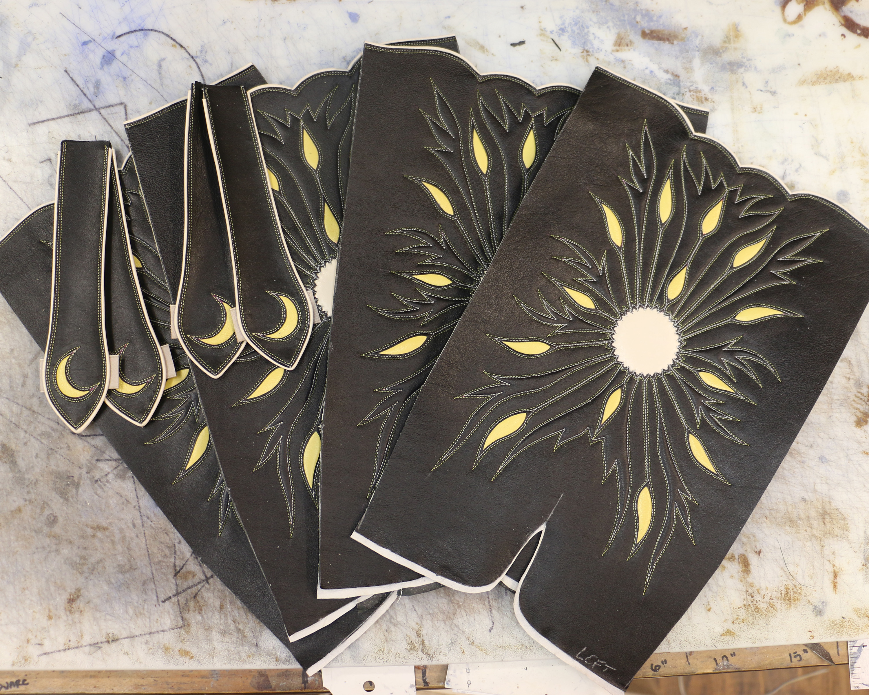 The sunburst boot tops are stitched now and ready to become cowboy boots.