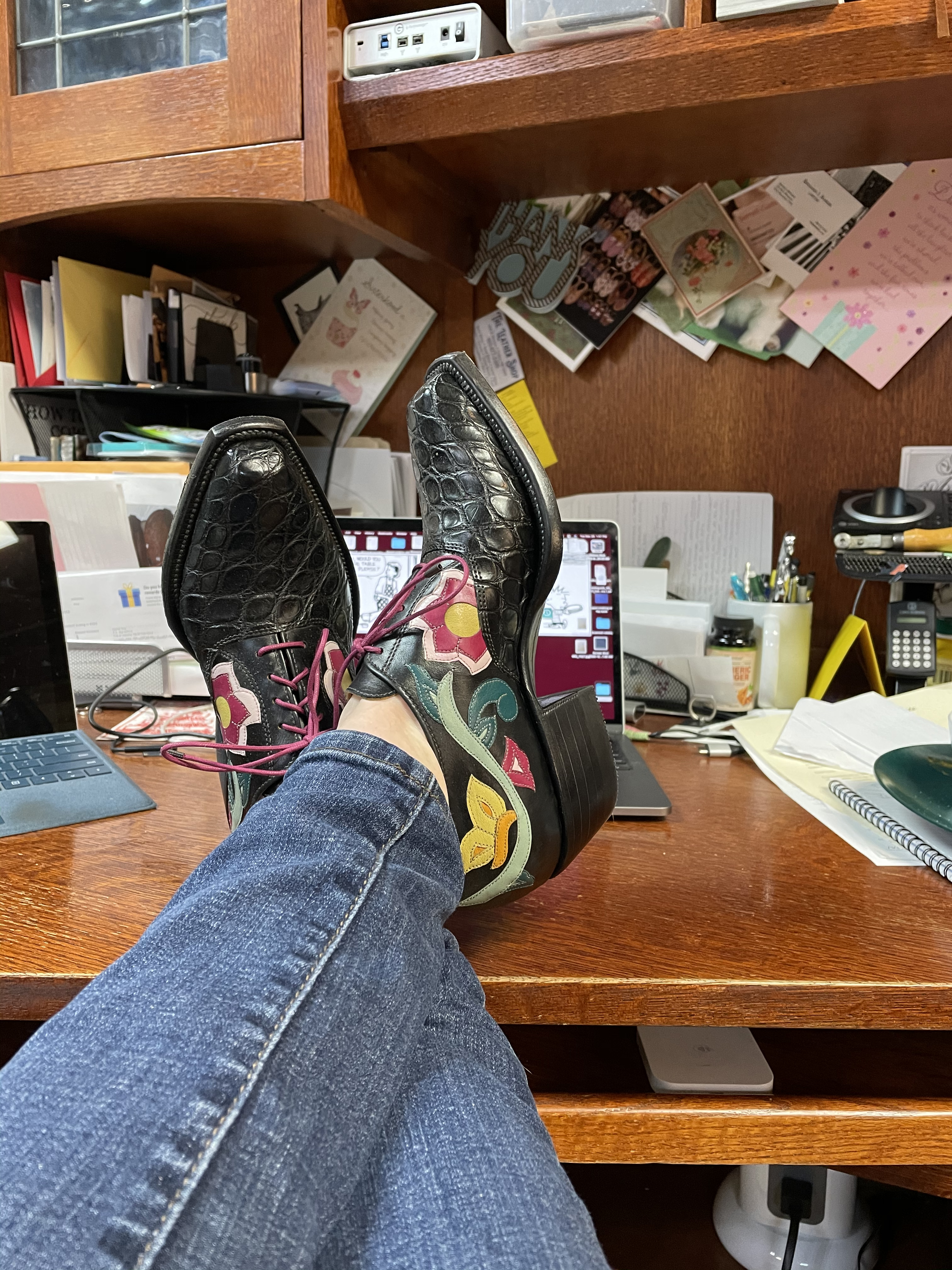 I finally decided to wear my new shoes. They’re comfortable, they feel like cowboy boots, and no one else in the whole world has a pair like them.