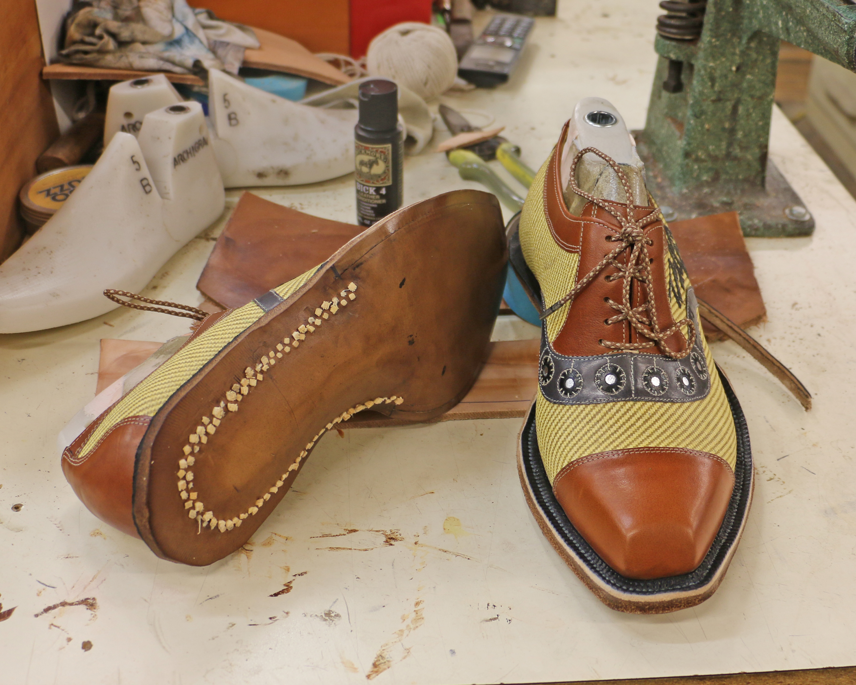 I came into the shop today to do some rearranging (it’s my hobby) and realized I’d forgotten to peg the soles on these shoes on Friday. They were in a plastic bag so they wouldn’t have dried out, but leaving them all weekend is an excellent way to get mold. So I pegged the soles with a double row of pegs and shined the forepart of the sole by rubbing it. See the three black dots on the sole on the left? Here’s the story on that: I’ve been waiting six months for a huge shipment of kangaroo leather, and it arrived on Friday while I was working on these shoes. I was So Excited I laid the shoes down on my bench — not realizing they were touching a metal tool — and rushed up front to help the truck driver bring in my leather. By the time I got back the metal tool had permanently stained the sole leather. I know better, but that’s what happens when I get a shipment of colored kangaroo, I guess.
