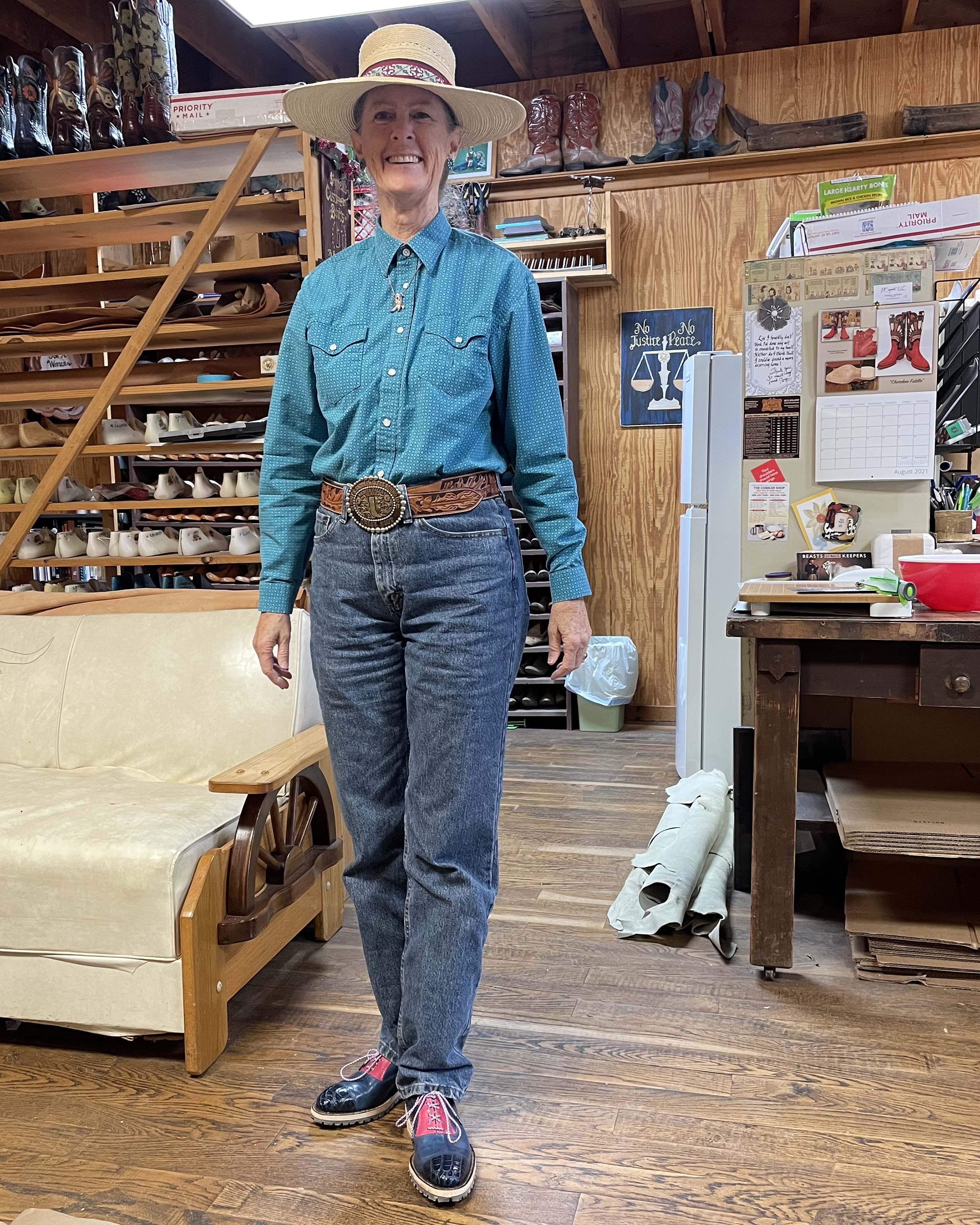 My friend and fellow boot maker Valerie Coe came out to Oklahoma and we made her a pair of shoes! In the photo where she’s wearing the shoes, if you look closely, you can see that she tried them on (to make sure they fit!) before we finished the sole edges and heels.