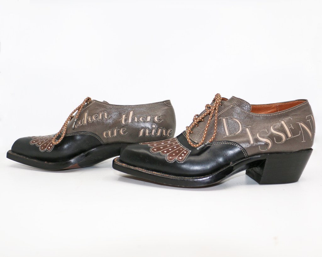 I started making these shoes when Ruth Bader Ginsberg died and it’s taken me this long to finish them. On the outside of the shoes are the words “DISSENT” and “RESIST.” The insides say “nevertheless she persisted” and “when there are nine.”