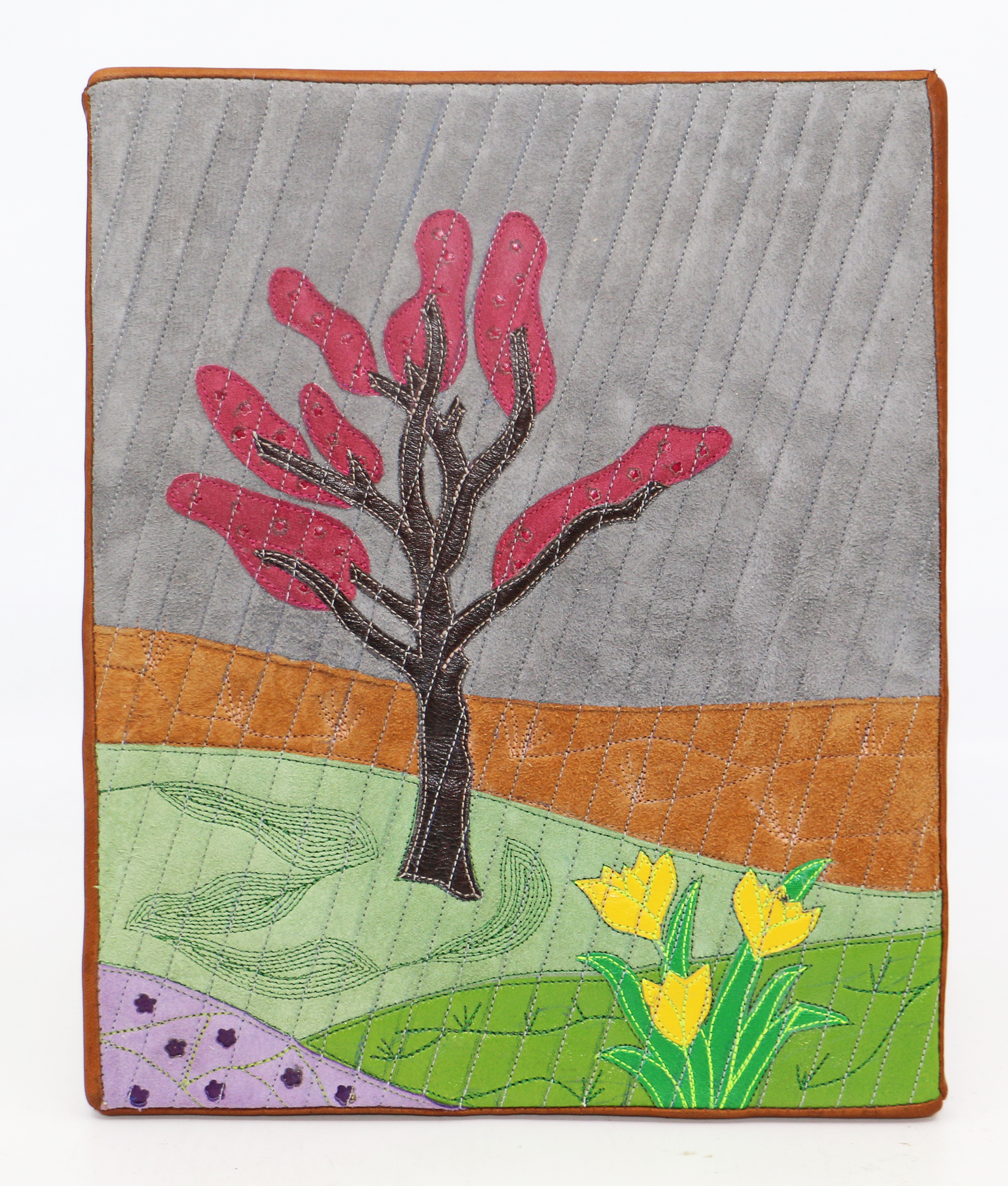 This one was kind of scary because I did all of the inlay/overlay work successfully, then took a deep breath and stitched gray lines over all of it in the hope it would look like rain. It does, but since I’m doing a type of art that (as far as I know) no one’s ever done before, I’m never sure if the completed piece will match my vision. I love gray and drizzly days and I can almost smell the rain when I look at this piece.