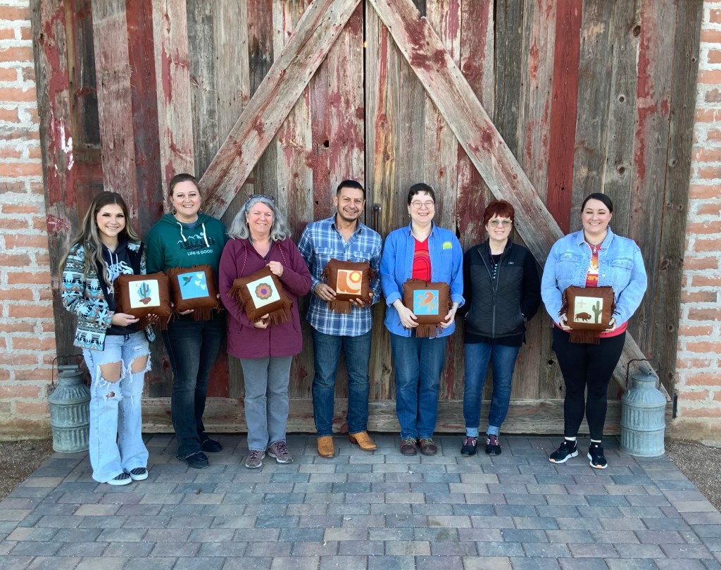 We had a successful leather inlay/overlay class at the Art of the Cowgirl event in Queen Creek, Arizona. All students completed two bracelets and a fringed leather pillow, and everyone seemed pleased.