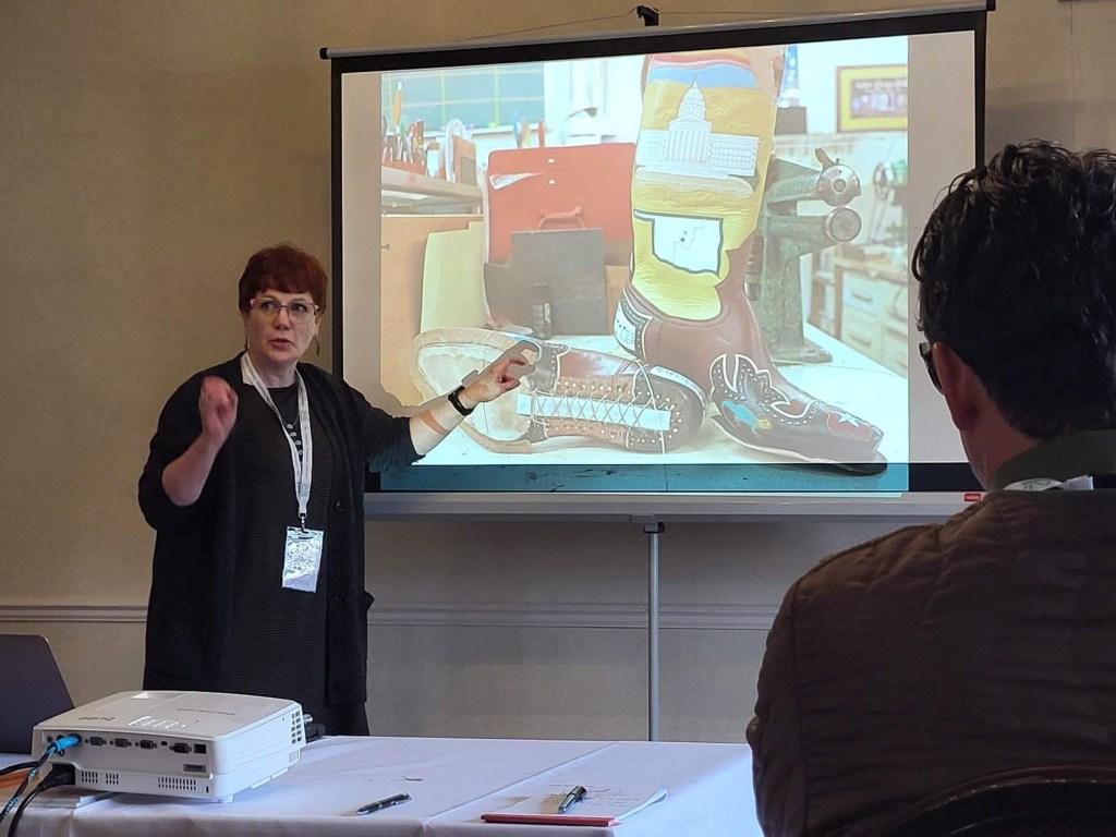 My friend Carina sent photos from my presentation at the conference! I spoke briefly about the history of leather inlay and overlay, and then talked about the making of the Oklahoma boots which are now on permanent display at the Oklahoma State Capitol.