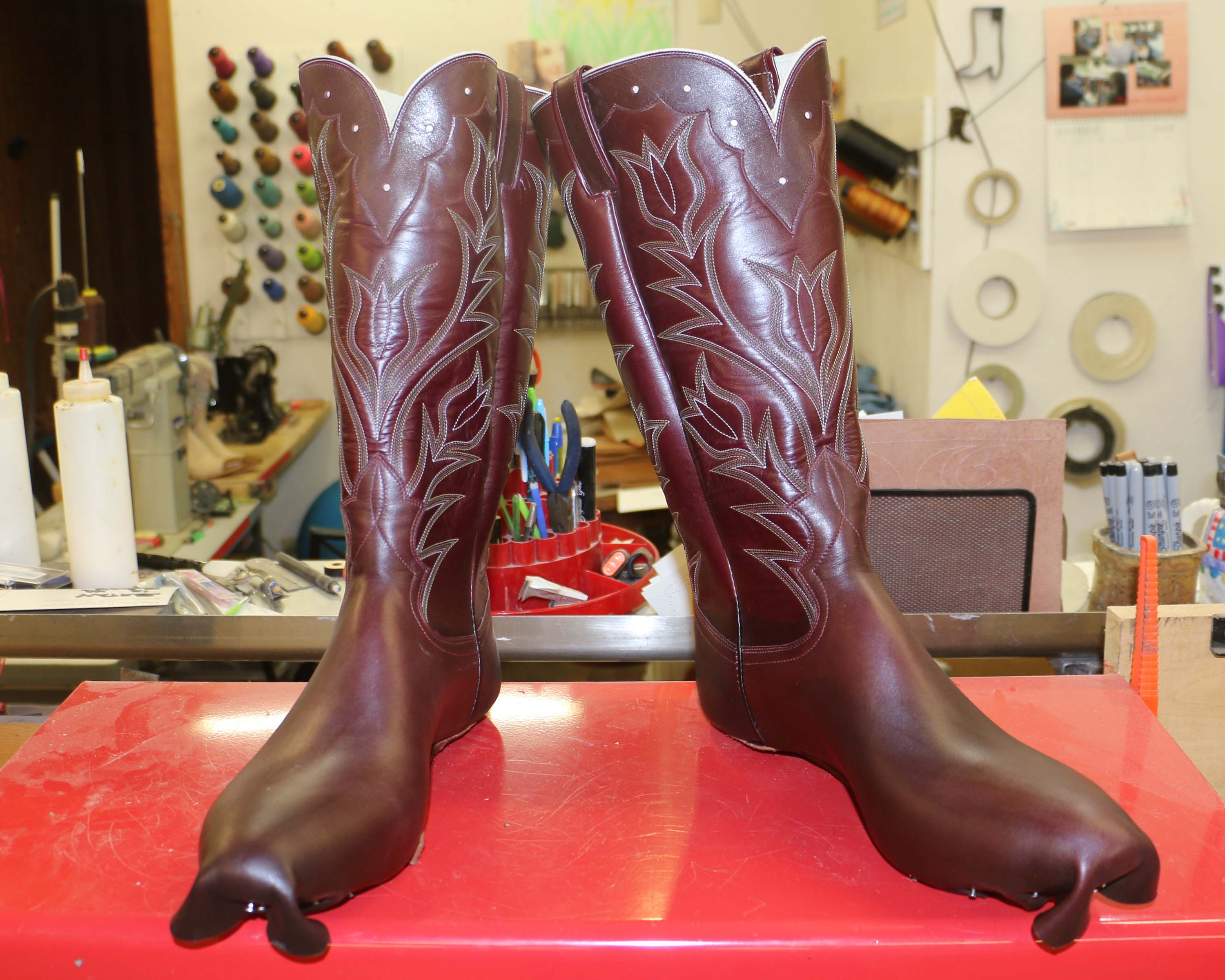 I think I’ve posted this pair once already, at this very same stage, but I wasn’t happy with the way they sat on the last the first time. I left them sitting for a while to make sure and they made me grumpy every time I looked at them, so if I’d continued I would have felt grumpy every time I worked on them and then I would have done a bad job. So today I took them off the lasts, re-wet them, and lasted them again. My inner demons have quieted now and it appears I will be allowed to continue without being in a foul mood.