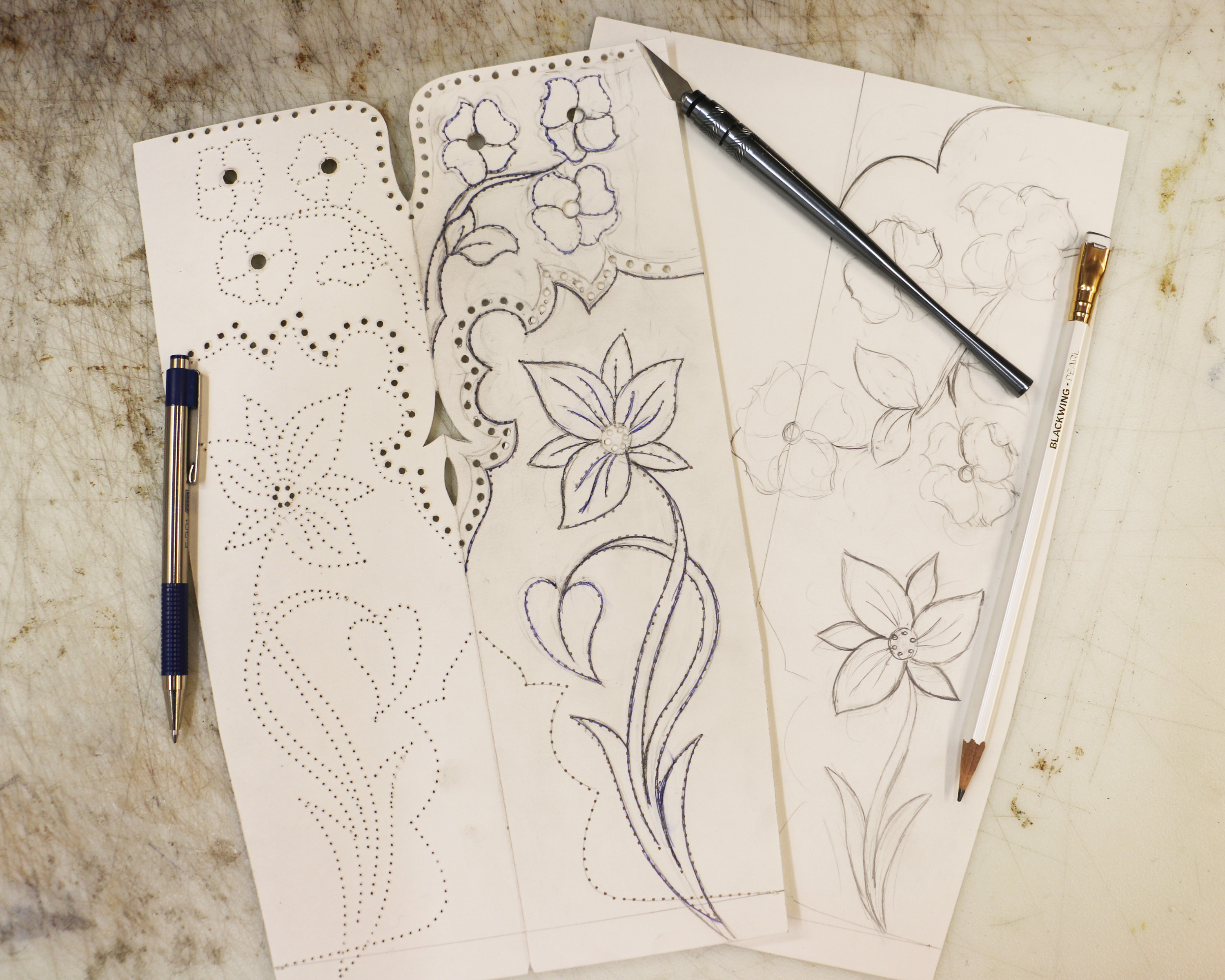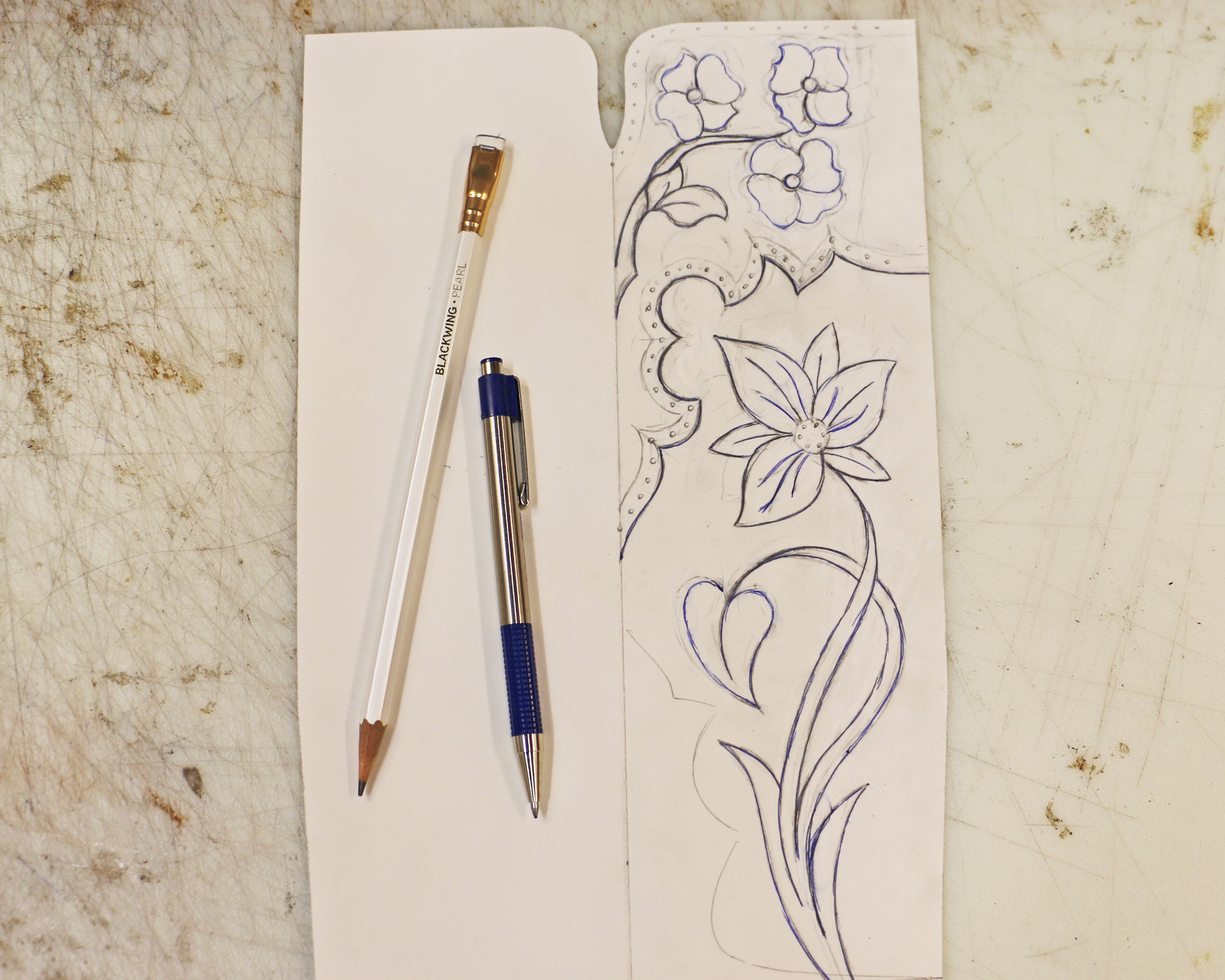 This photo shows my original attempt at a design. It wasn’t inspiring me at all so I laid it aside and contemplated for a bit. I was pleased that I did not waste any time telling myself that I’m a crappy artist and I’ll never be able to draw a good design — I thought about it for a while, decided what I liked and what I didn’t like, and then drew a new design that made me happy.