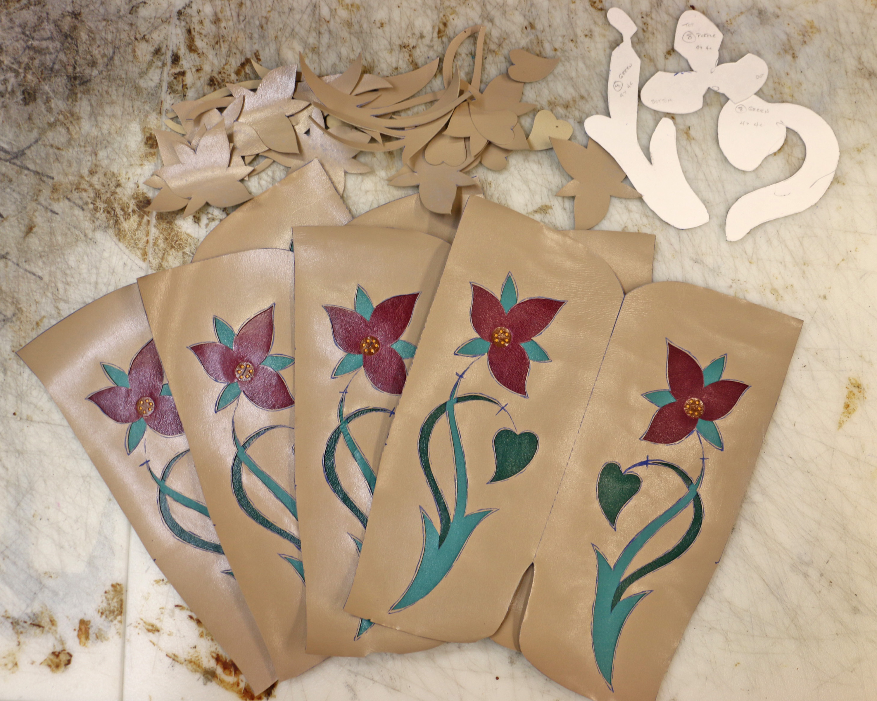 I finished the Wake Robin flowers on the boot tops, took a quick photo with the band laid over the boot top so I could see how they look together, and cut out the little intertwining bands for the toe and heel.