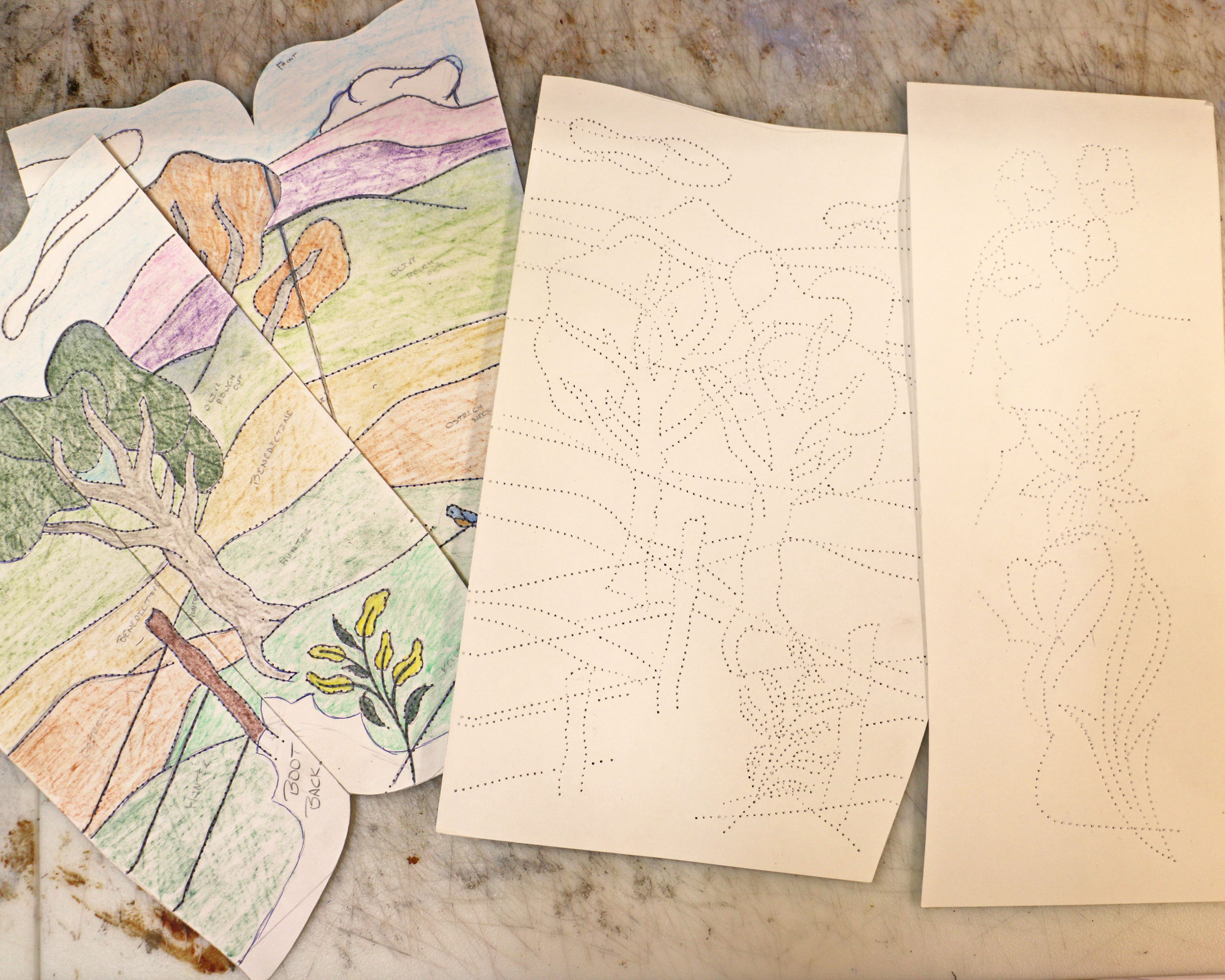 I create my pattern design templates by stitching the poster board with no thread in the needle. The holes will close if you don’t have an extra piece of poster board behind the pattern template as you’re sewing. The backing pieces can be reused multiple times and after a while they become their own sort of art (right before I throw them away, that is).