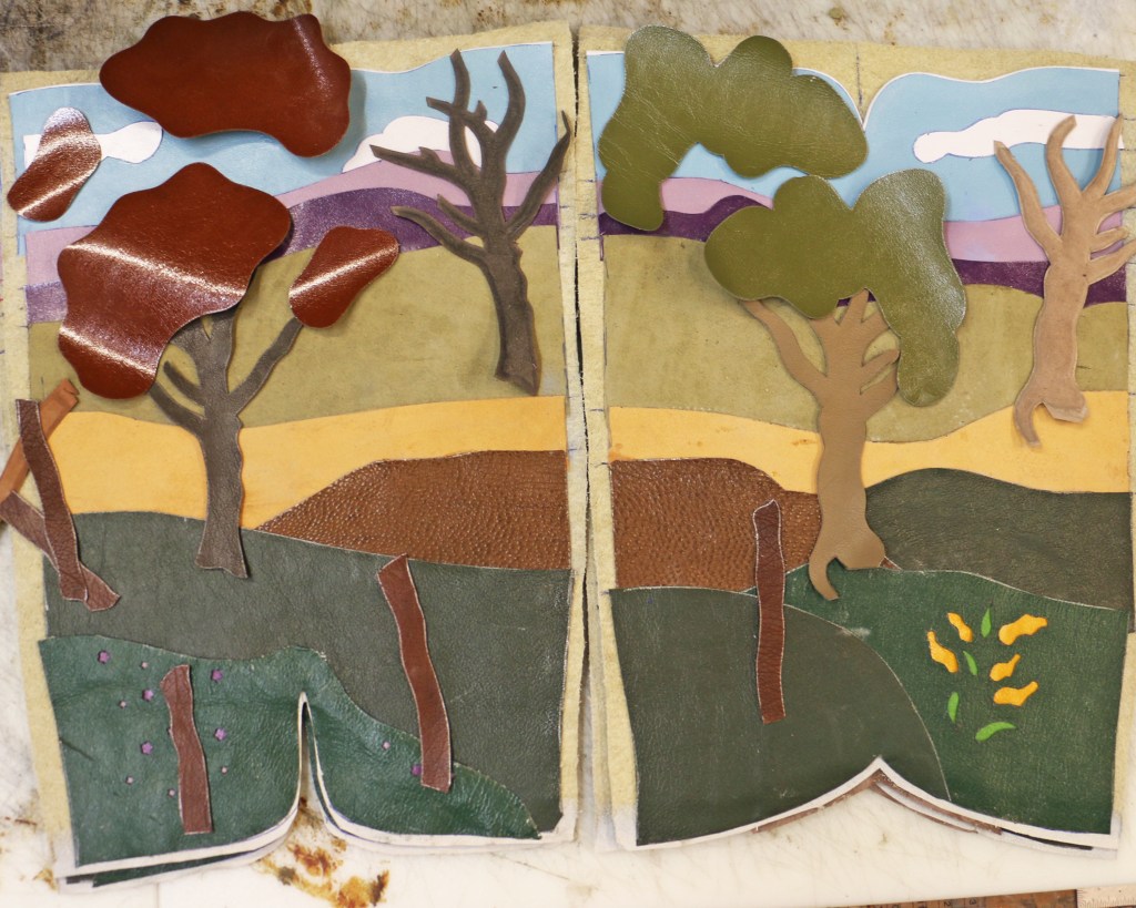 The final puzzle piece for the landscape boot tops was the tree trunks. I was relieved when I had skived all four little trees without lopping off any branches and having to start over. Even though the tops already have many components, the stitching will add all the final details like shadows in the grass and wire between the fence posts, plus there’s a tiny little bluebird who’ll be sitting on the fence.