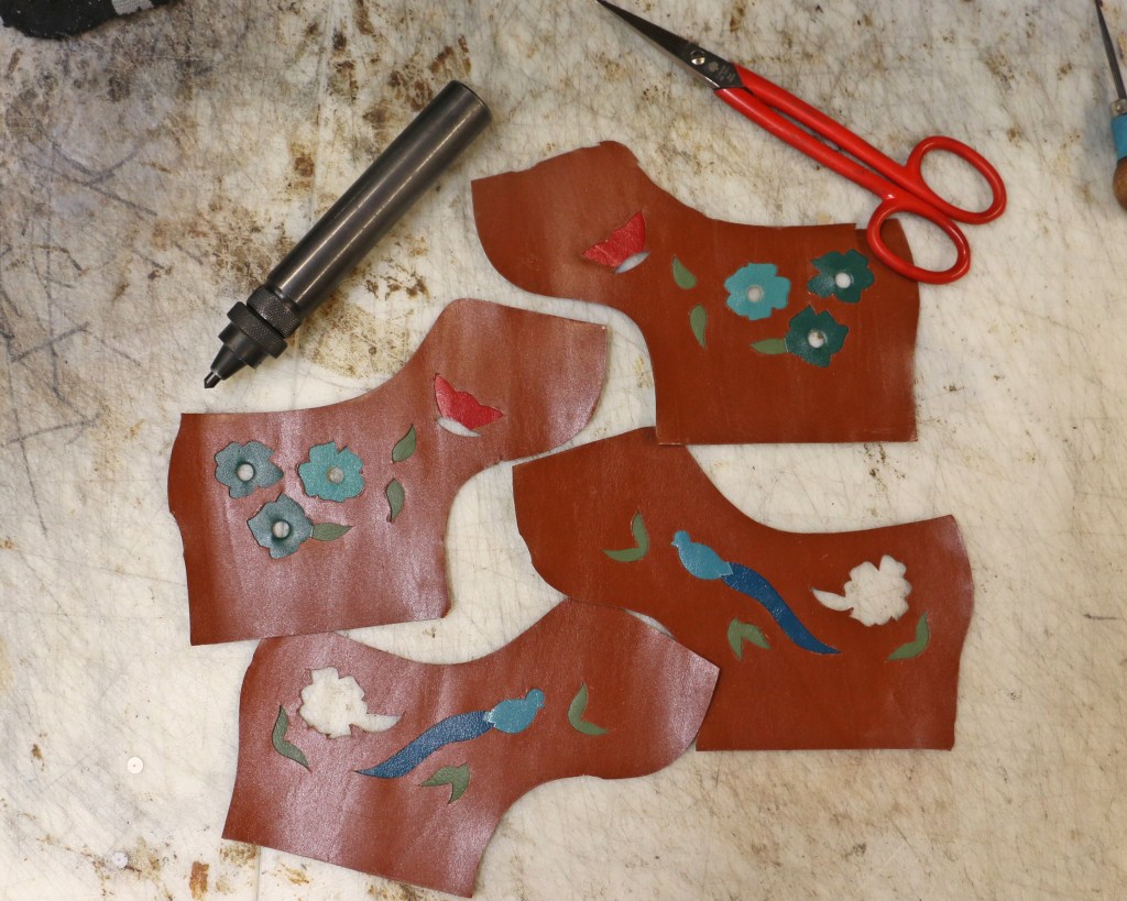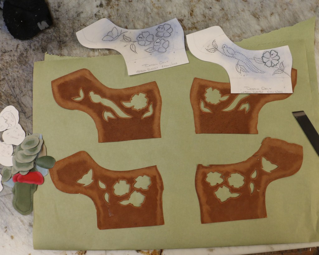 First photo: I’ve cut out all the shaped holes and skived them; off to the left you can see bits of leather that will go in the holes.