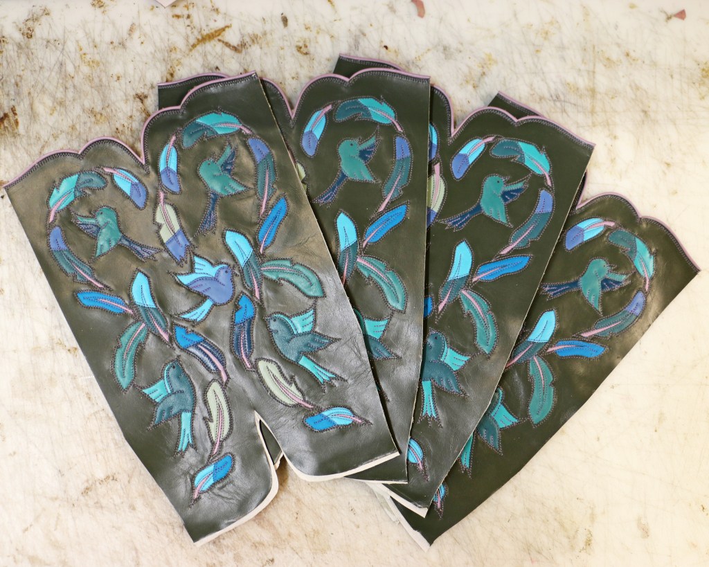 All four bluebird top panels are stitched. Considering each panel took me around an hour, I’m pleased to have them finished. My usual goal when designing and stitching a boot top is to be able to start, stitch the entire boot top, and finish right back where I began without stopping. I managed that on three of these panels, but on one panel I kept getting distracted so I had to go back in and sew a couple of things.
