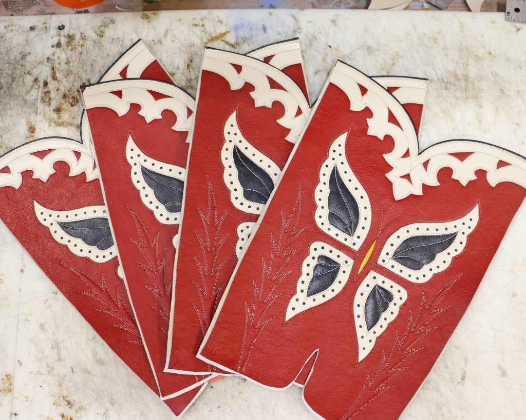 Here’s an excerpt from a presentation about cowboy boots explaining why butterflies were and are such a popular theme for cowboy boots: “One reason for the prevalence of flowers, butterflies, and occasionally eagles on cowboy boot tops was simply practicality. A typical cowboy boot has a scallop that comes down into the boot tops, and the boot tongue extends up on the boot tops. This leaves sort of an H shape for decorative work. Flowers can flow into this space and fill it, but butterflies and eagles with their outstretched wings also fill the shape well.”