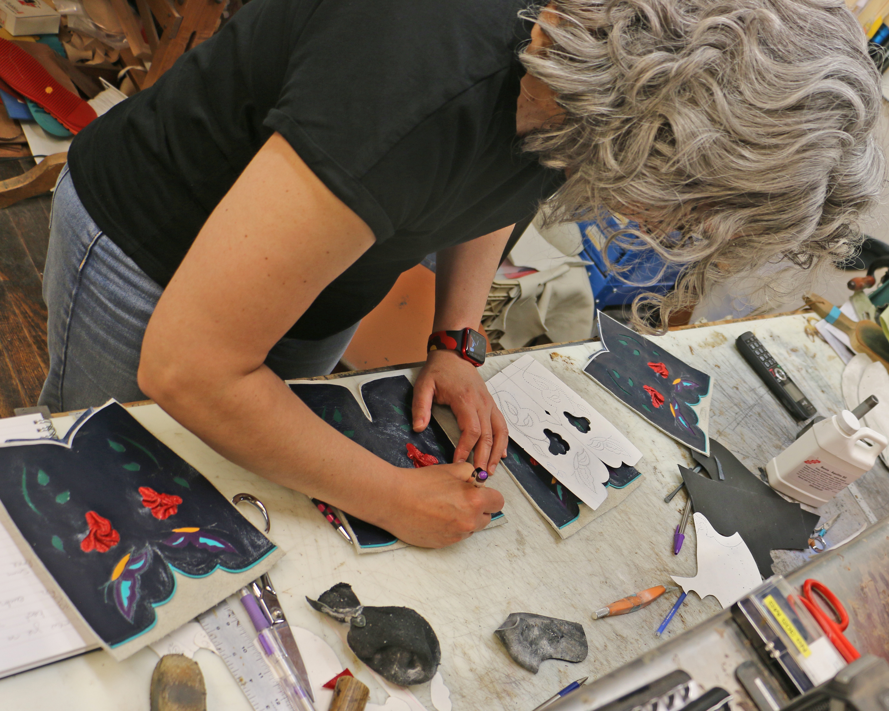 If it appears she’s sitting in the dark with a circle of light at the machine, she is. All of my shop lights decided to burn out the week before she arrived so we’re supplementing with multiple desk lights.