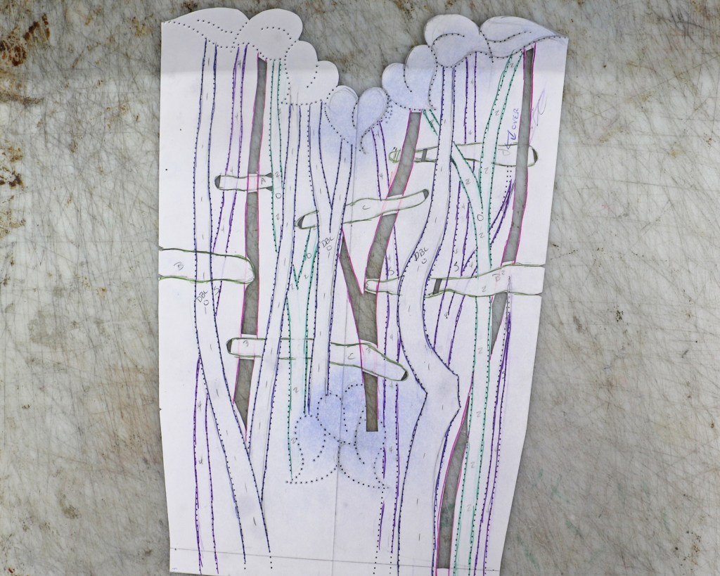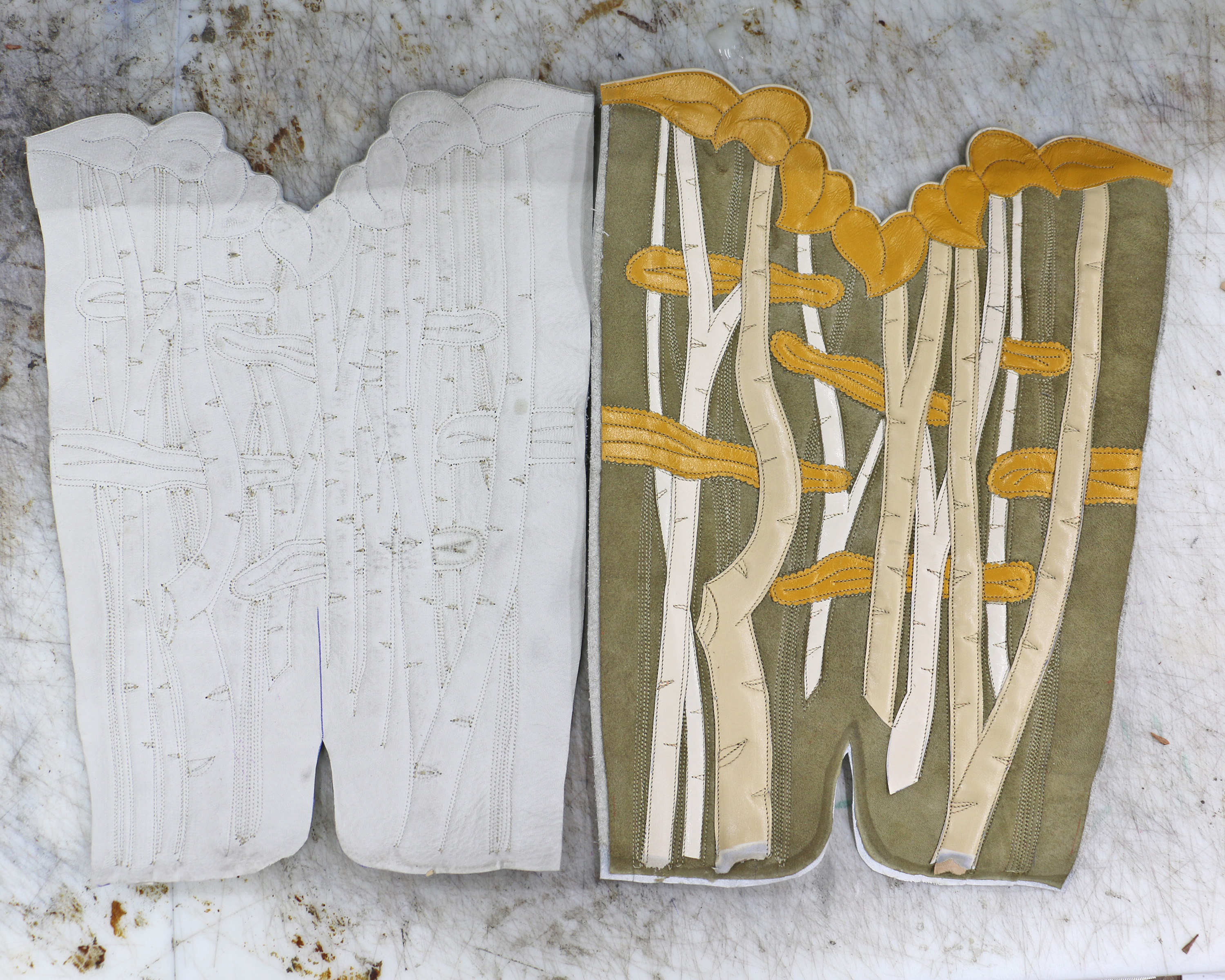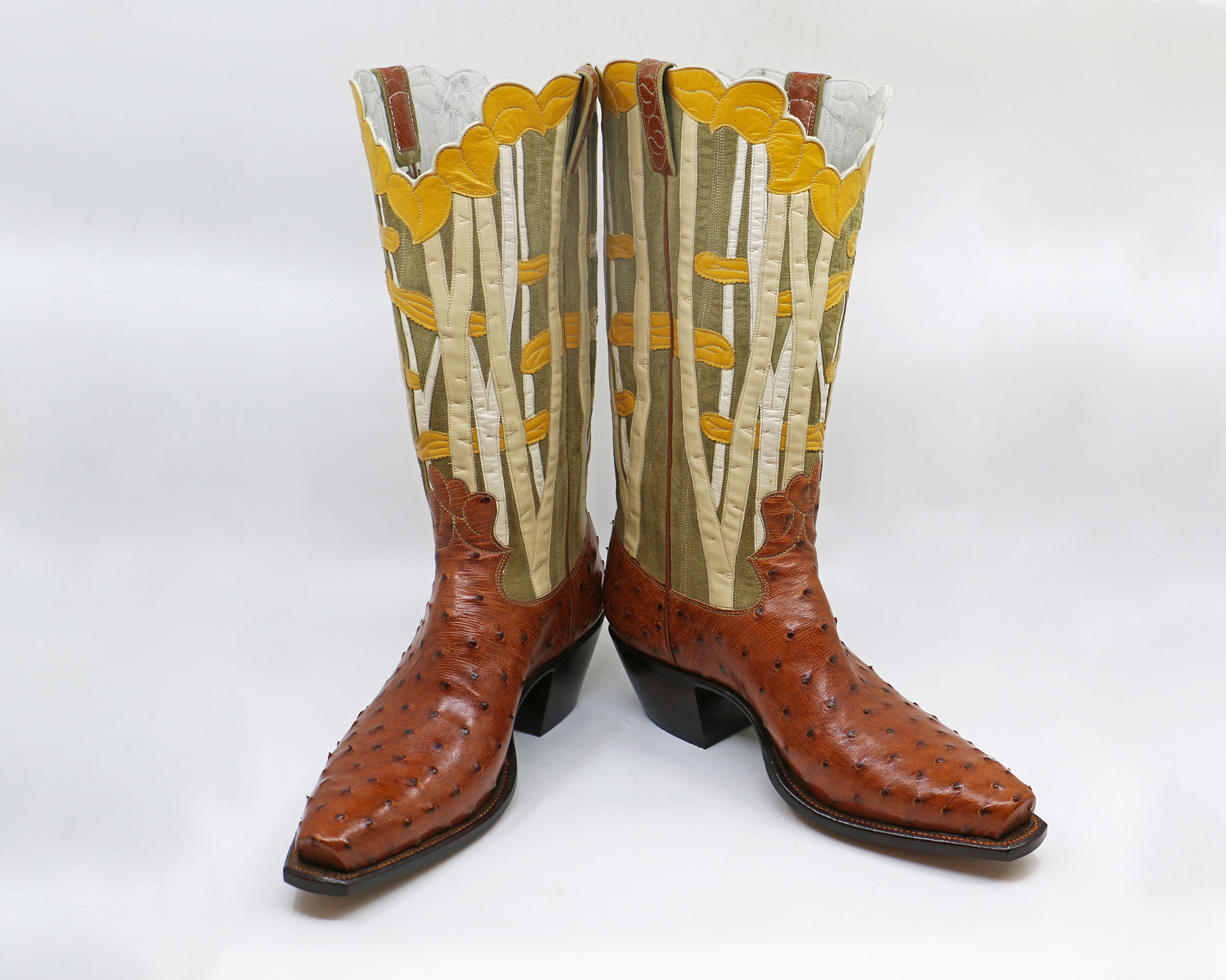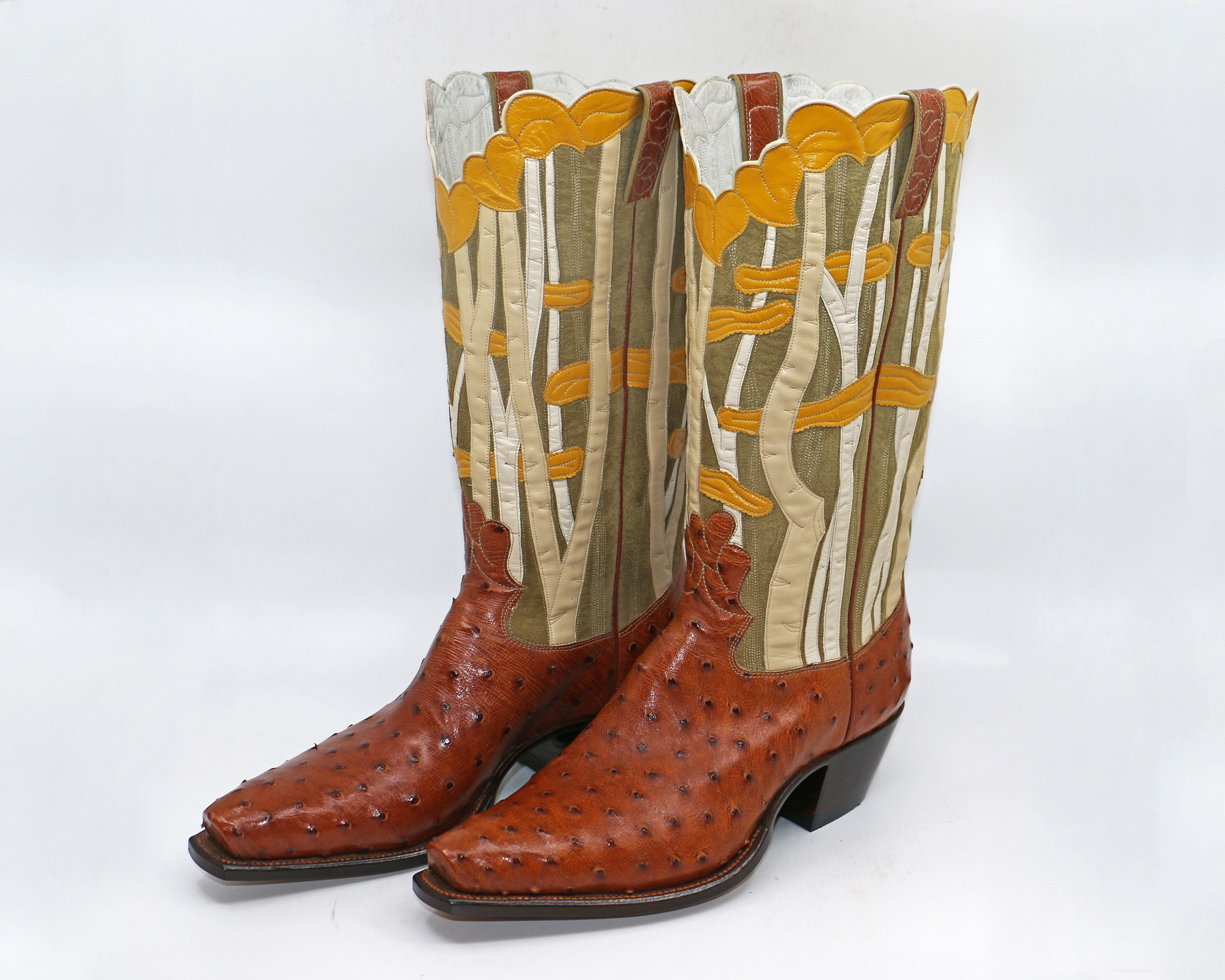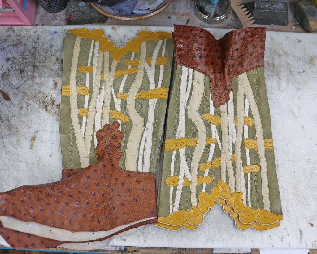 A few years ago I began creating art pieces based on concepts that are difficult to convey with my medium of leather inlay, overlay, and stitching — things like light, shadow, movement, and reflection. I had an idea for conveying depth and in a moment of hubris I decided to do it in boot top form rather than a single art piece. My idea was to do a grove of aspen trees, hoping for the feeling of looking into a forest.