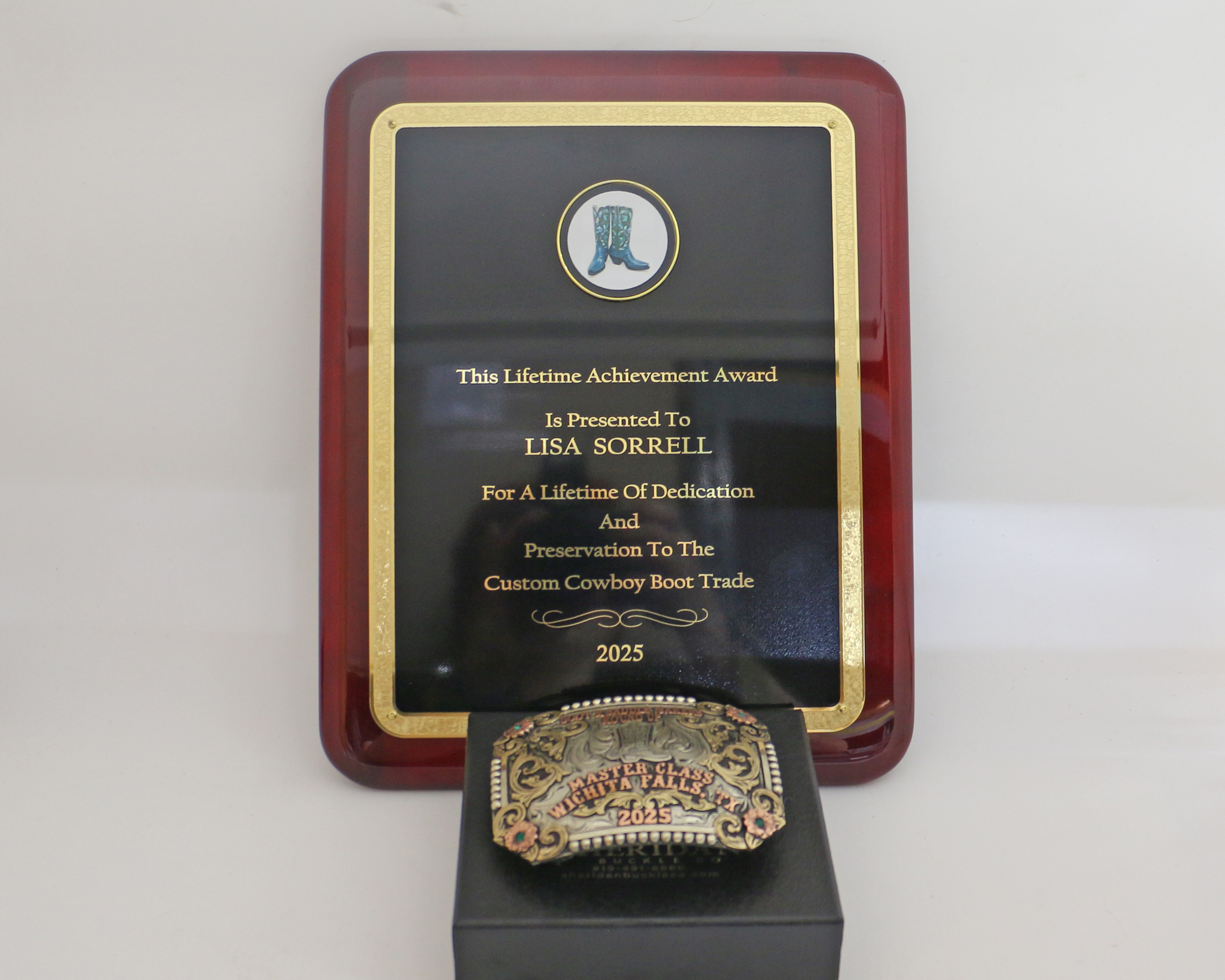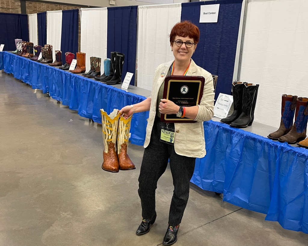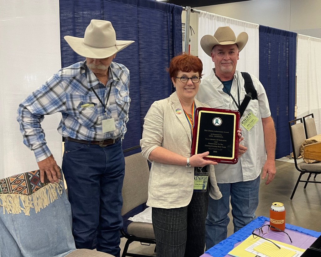 This past weekend, at the Boot and Saddlemakers Roundup in Wichita Falls, Texas, I was honored with a Lifetime Achievement Award. Some of my students and friends and mentors spoke prior to presenting the award, and the beautiful things they said about me indicated that perhaps I’ve achieved my goal. The MacArthur Fellowship jurors are secret and there’s no way to apply or be nominated, so my chances are similar to winning the lottery. But I will always be grateful that I found the award and decided to try and be the sort of artist they’d recognize. The initial goal — to win — was too small. I’m glad I pursued generosity and learning and teaching and growing as an artist, because it made me a winner!