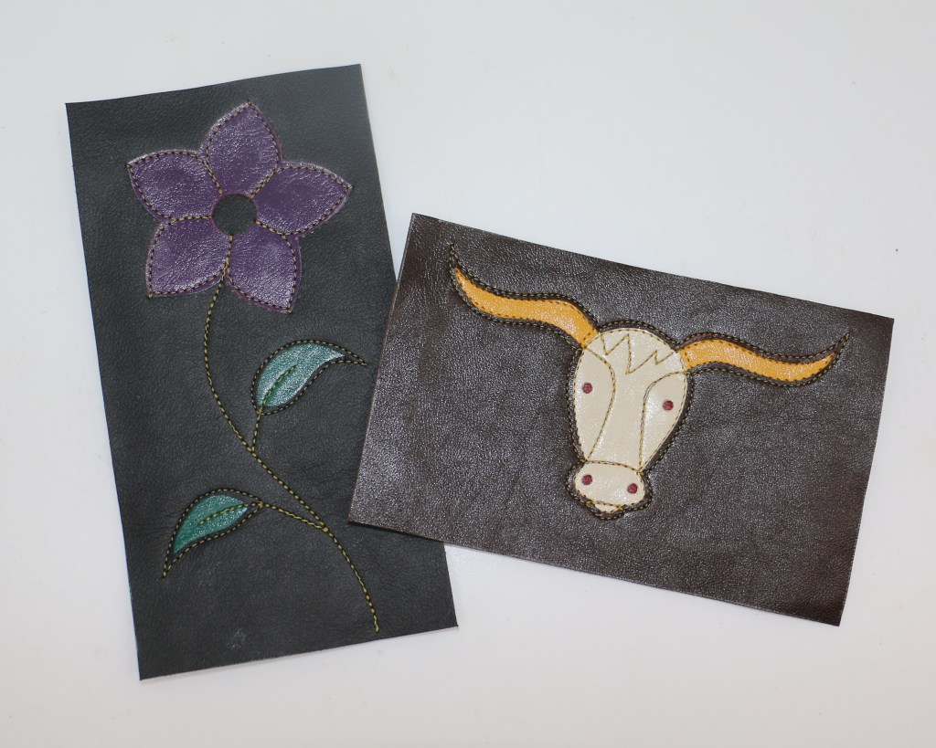 I’ve attached a photo of the two projects, done by me. I was getting ready to make mine before the class to show as examples, when I realized that both pieces were so simple it would be better to demonstrate them instead. That way, instead of explaining cutting and skiving in words, I could actually show them the techniques as I made the pieces.