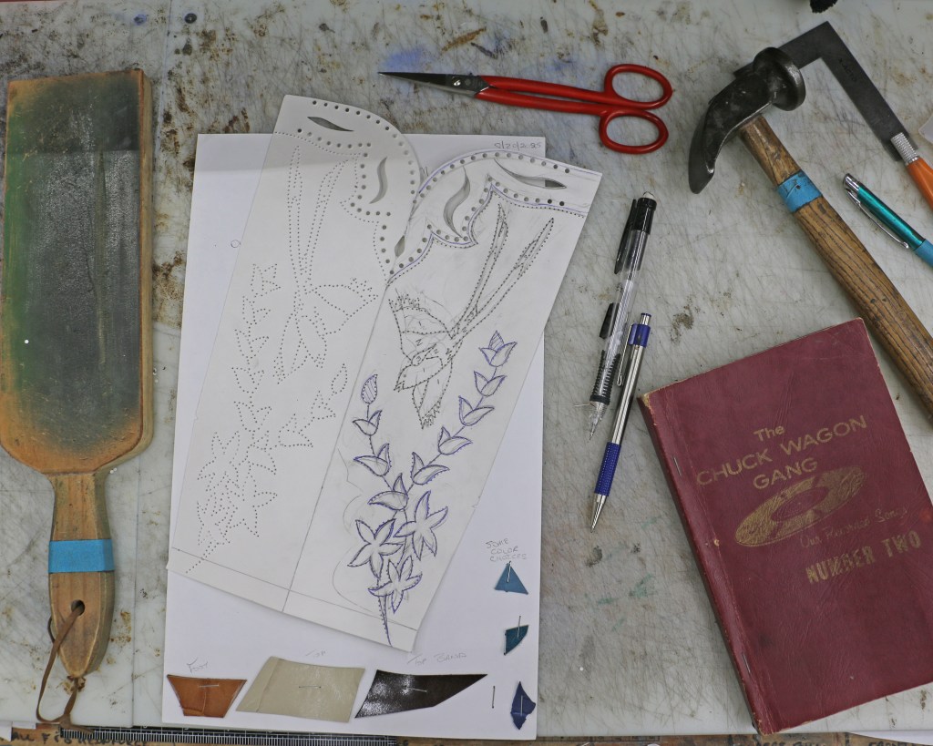 New design for a pair of boots honoring both Oklahoma (scissortail bird) and Texas (bluebonnets)