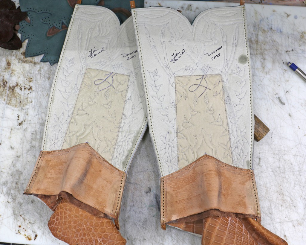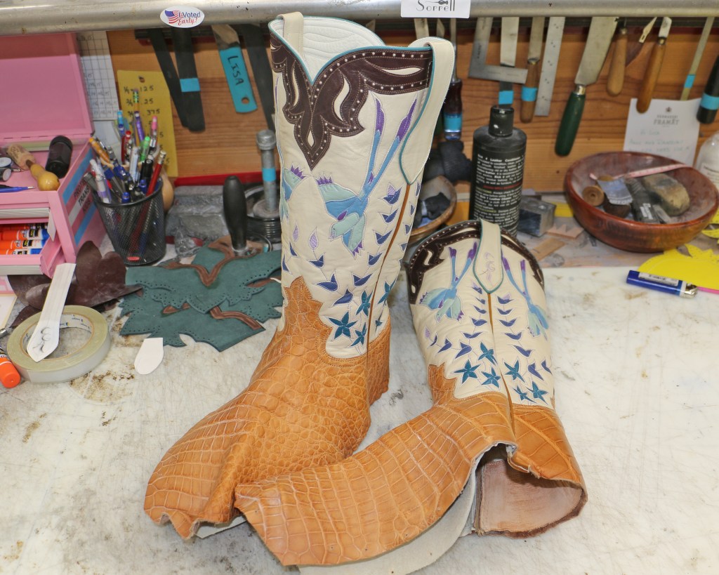 The side seams on cowboy boots are sewn with the right sides of the boots together so they’re inside-out. They’re turned (or wrestled) the right way out and then they’re ready to be put on the last, or boot form.