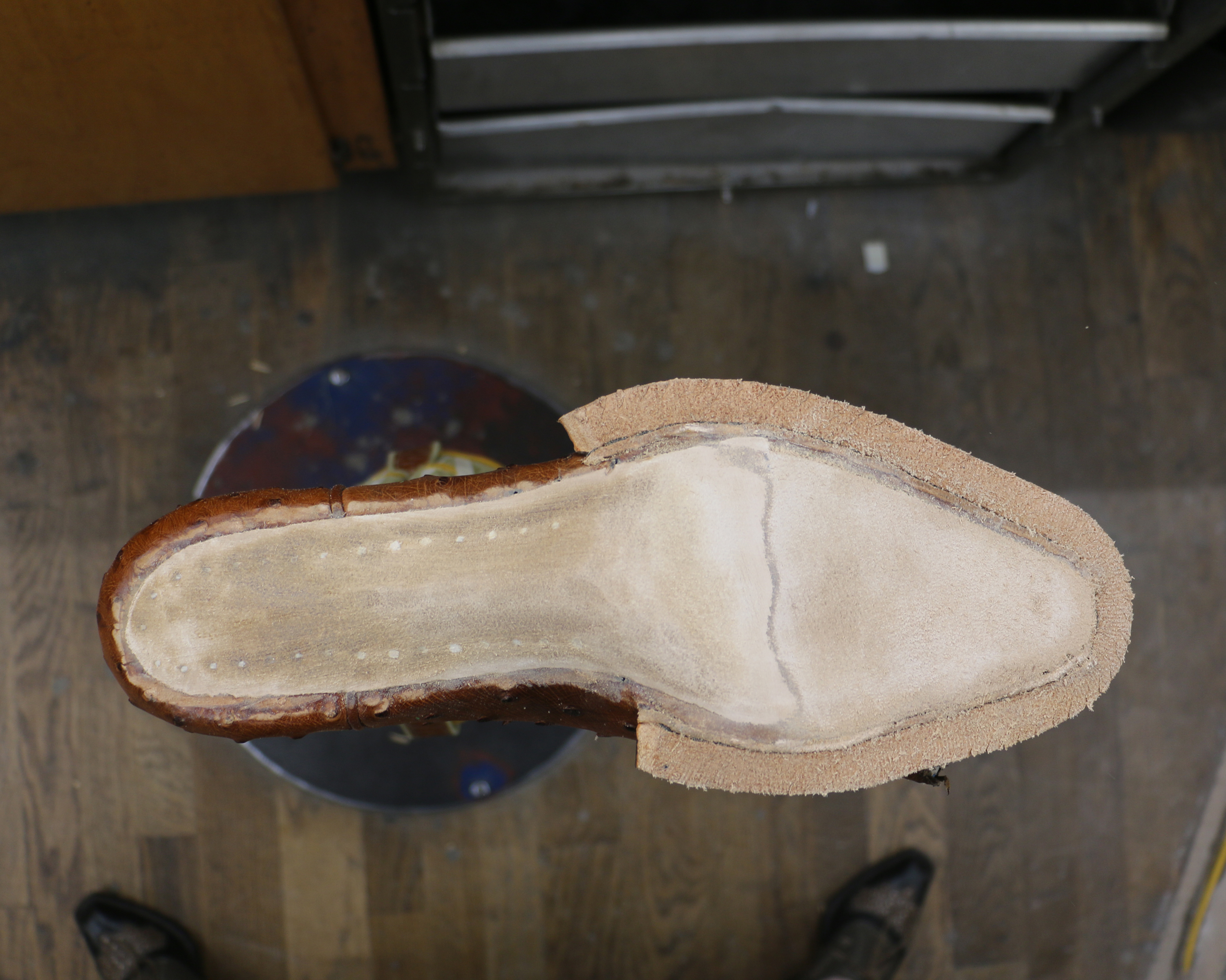 After I’ve built the heels to the correct height, I add the rubber heel cap. Next I pull the lasts out so I can do the final heel shaping.