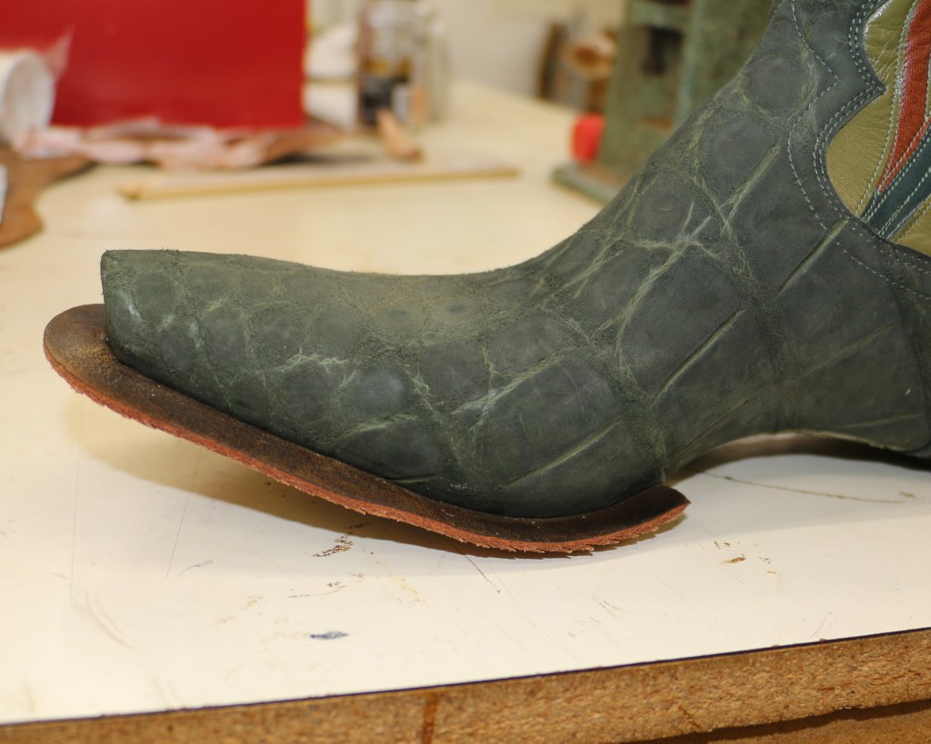 The welt is that narrow strip of brown leather that I’ve sewn onto the boots by hand. The process of sewing on the welt is called inseaming, and it’s my favorite part of the boot making process. Well… inseaming and skiving a really complicated design. Those are my favorite things. Oh, and drawing designs and making the patterns for it. Also when the customer pulls on the boots and their heel thunks into the boot and they fit properly. That’s definitely my favorite thing.