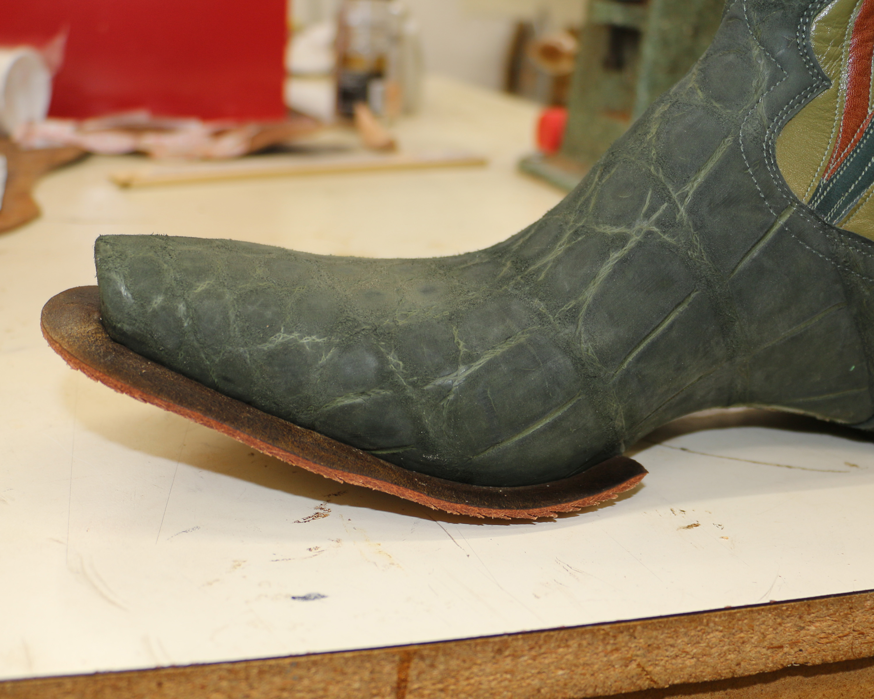 The welt is that narrow strip of brown leather that I’ve sewn onto the boots by hand. The process of sewing on the welt is called inseaming, and it’s my favorite part of the boot making process. Well… inseaming and skiving a really complicated design. Those are my favorite things. Oh, and drawing designs and making the patterns for it. Also when the customer pulls on the boots and their heel thunks into the boot and they fit properly. That’s definitely my favorite thing.